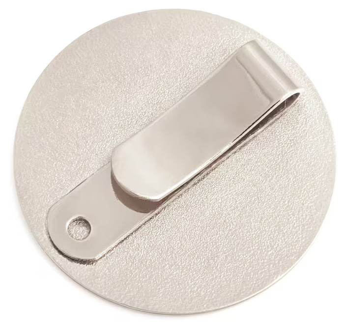 Ytan på broschen är enhetligt silverfärgad med en subtil, texturerad finish som ger ett jämnt och fylligt intryck. Denna textur täcker hela framsidan, vilket skapar en visuell kontrast till den släta klämman som finns på baksidan av broschen. Klämman är gjord av metall och är designad för att enkelt kunna fästas på olika material utan att skada tyget det fästs på.
