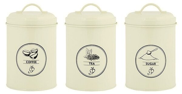 Plåtburkar med lock som finns i 3 olika varianter - Kaffe, Te & Socker. Från Garden Life.