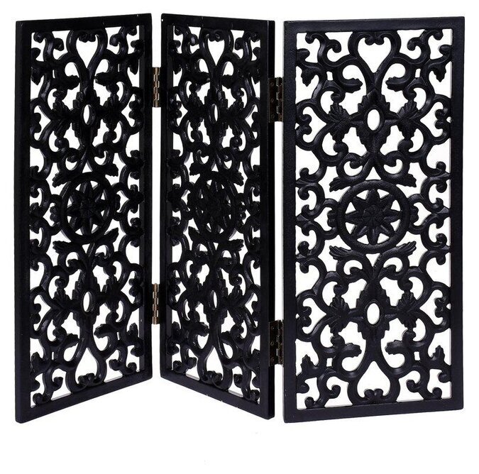 De svarta panelerna är anslutna med robusta gångjärn, vilket gör det enkelt att justera vinkeln på varje sektion för att ge önskad grad av insynsskydd. Mönstret har ett klassiskt inspirerat tema med komplexa slingor och former som bildar ett harmoniskt helhetsintryck. Centralt i var och en av sektionerna finns en stjärnliknande figur, noggrant utmejslad för att accentuera designens centrala fokuspunkt.
