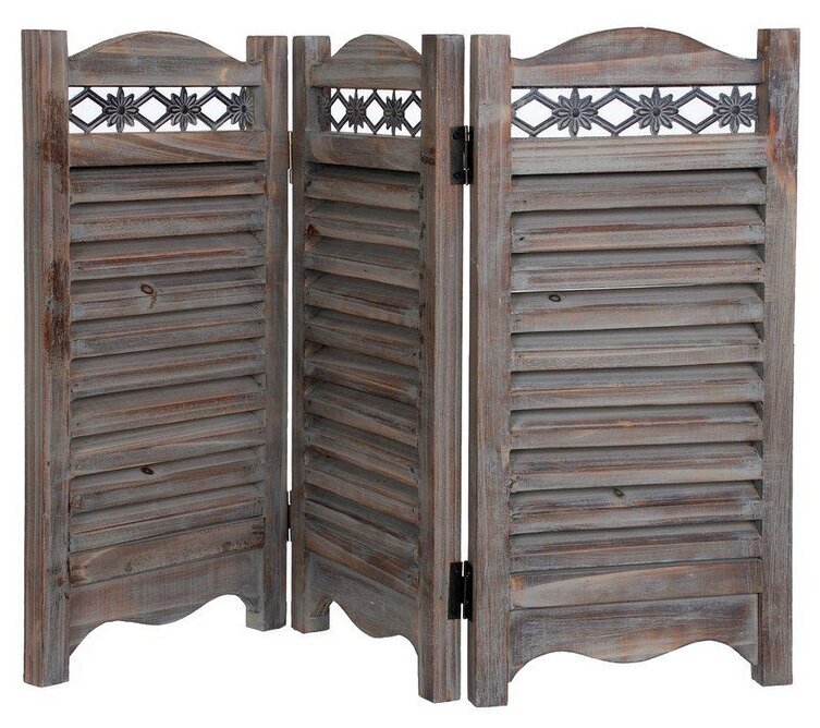 Varje panel är uppbyggd av horisontella lameller som löper parallellt längs hela höjden, vilket effektivt ger ett behagligt ljusinsläpp samtidigt som det begränsar insyn. Lamellerna har en sliten ytfinish vilket tillför en viss rustik charm till verkets utseende. Panelerna har också en särpräglad dekor högst upp, där utsnidade blommönster skapar ett stilfullt och intressant ornament.
