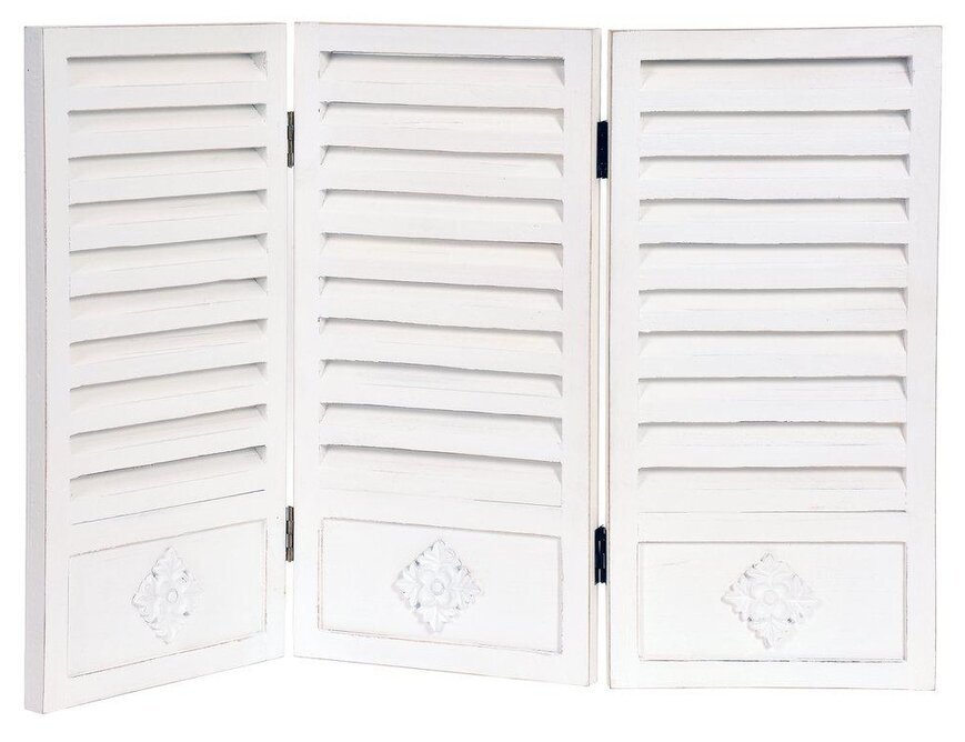 3-delad jalusi med gångjärn som blir en fin inredningsdekoration samt bra fönsterskydd mot insyn & sol. Fönsterjalusien som är vit har en lite sliten look, shabby chic, & det kan förkomma lite märken & färgavvikelser vilket gör jalusin unik i sitt utförande.
