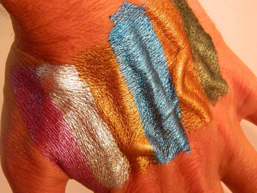På bilden från Köpstaden.se syns en hand prydd med flera breda streck av vackra, metalliska färger. Dessa färger är applicerade på hudens ovansida och tycks lyfta fram den skimrande kvalitén hos sminket. Det första strecket är en lila metallic, som fångar ljuset med en intensiv glans. Den lila nyansen, likt solnedgångens sista strålar, har en nästan hypnotisk kvalitet och bryter av mot de övriga färgerna i en harmonisk kontrast.