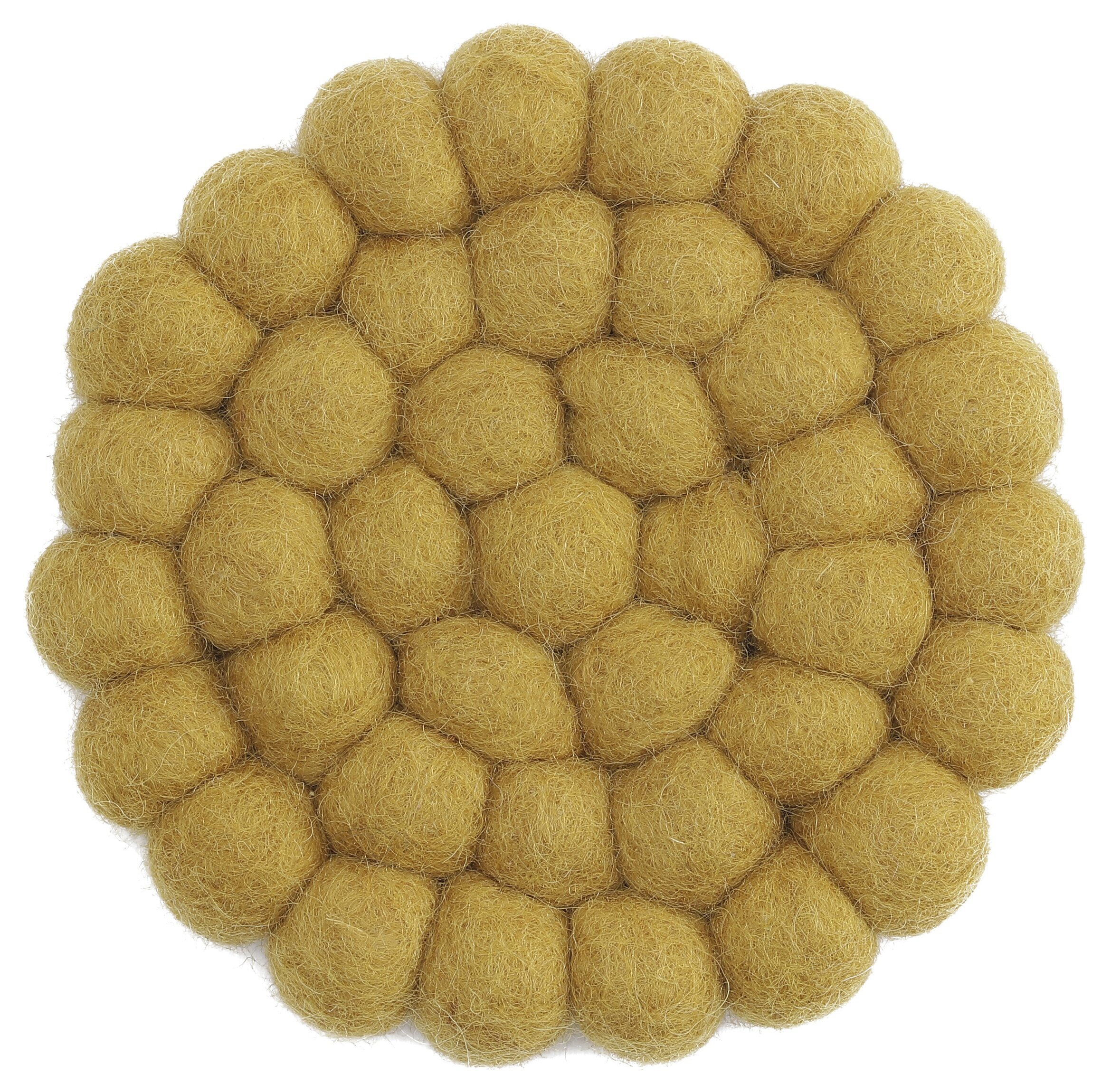 Varje ullboll är individuellt formad, vilket ger en liten variation inom strukturen, vilket bara förstärker dess charm. Trots denna variation bibehåller underlägget en enhetlig och konsistent form. Ullens naturliga fibrer är subtilt synliga, vilket ger underlägget ett texturerat utseende. Detta gör det också praktiskt som underlägg, eftersom den tovade ullen effektivt skyddar ytor från värme och repor.