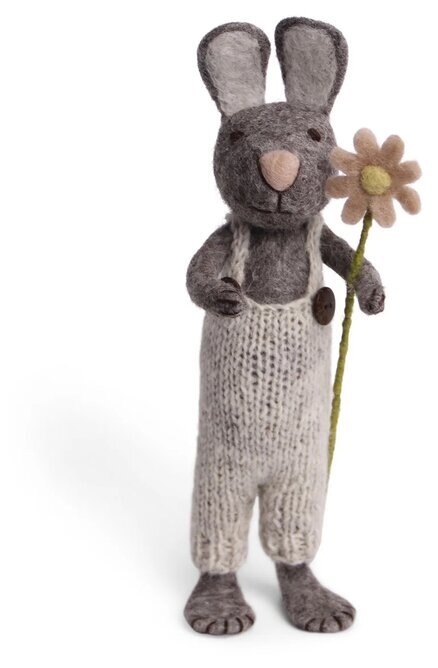 Vacker kanin med byxdress som håller i en blomma, kaninen tillverkas av tovad ull från Nya Zeeland & görs för hand av nepalesiska kvinnor i Nepal. Varje kanin är unik i sitt utförande, det kan därmed skilja i storlek, utseende & form.