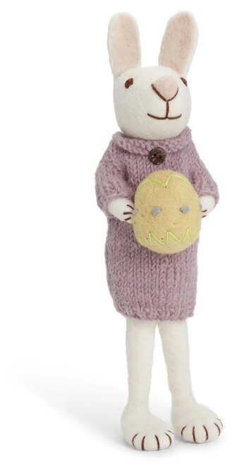 Vacker kanin med lila klänning som håller i ett ägg, kaninen tillverkas av tovad ull från Nya Zeeland & görs för hand av nepalesiska kvinnor i Nepal. Varje kanin är unik i sitt utförande, det kan därmed skilja i storlek, utseende & form.