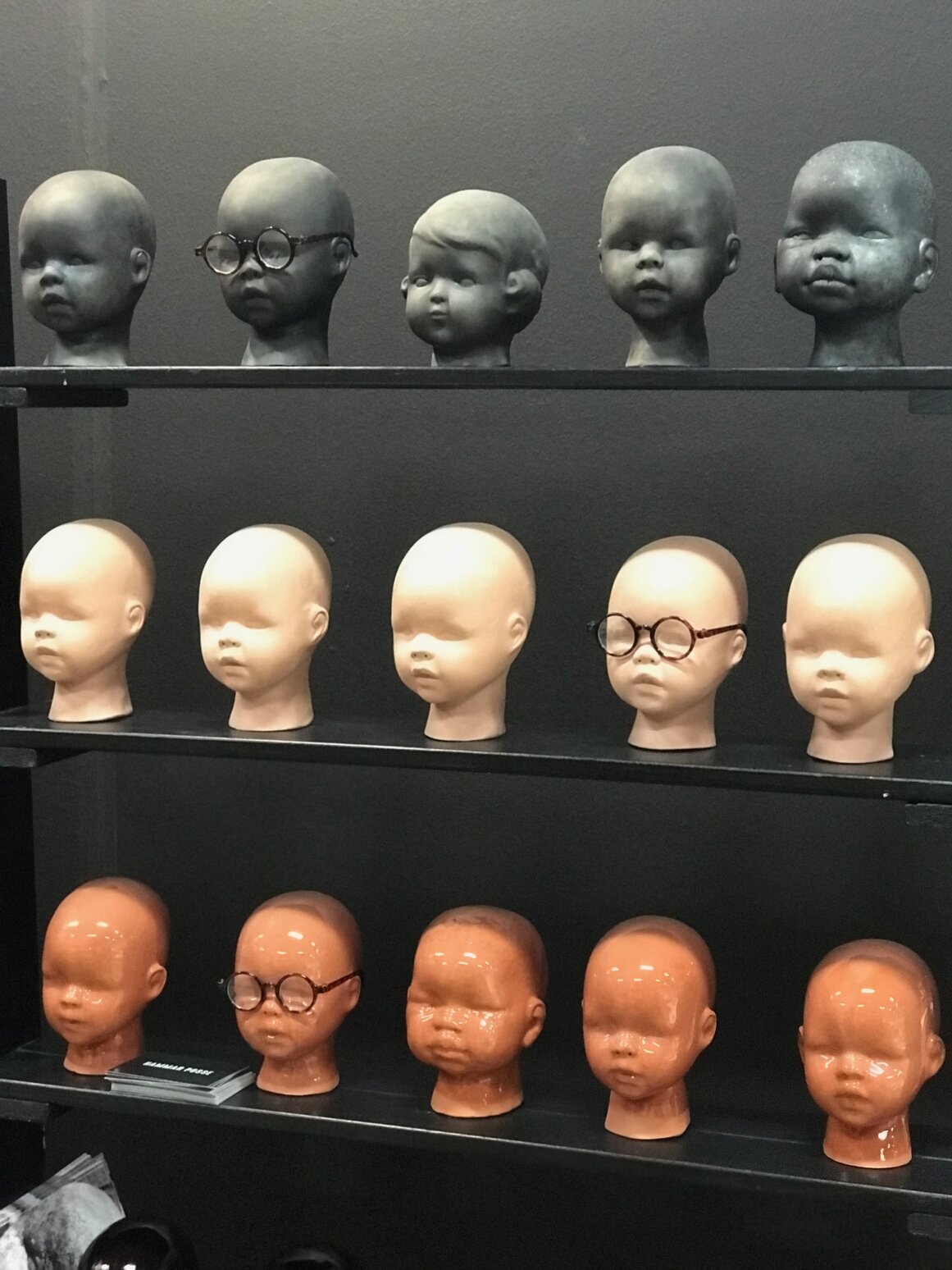 Det nedre hyllplanet innehåller huvuden i en varm, terrakotta-liknande färg. Dessa huvuden har en glansig yta som reflekterar ljuset på ett intressant sätt, vilket ger en dimension av liv till hela sammansättningen. Precis som på de andra hyllplanen finns här ett huvud som bär glasögon, vilket speglar den konsekventa integrationen av Hammar Posses produkter i utställningen.