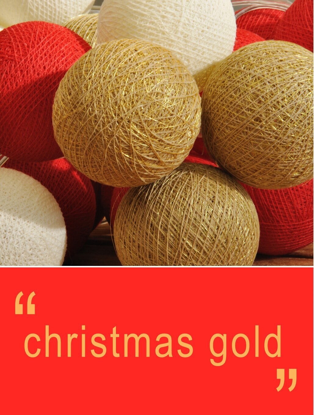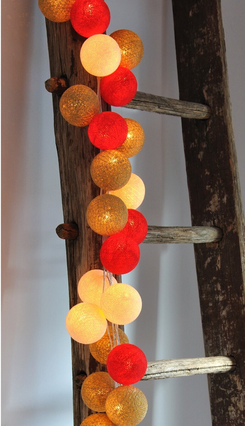 Dessa underbara ljusslingor från Happy Lights kommer förpackade i en box innehållande 20 stycken bollar samt medföljande ljusslinga med 2 stycken extra lampor. Använd ljusslingorna som dekoration, mysbelysning, till festligheter mm. Fin att dekorera på dukat bord, i barnrummet osv. Bollarna är virade av färgat garn och är ca 6-7 cm i diameter. Finns en mängd av olika kombinationer & denna boxen innehåller färgerna Red, Ivory samt Gold. Man sätter själv ihop ljusslingan med bollarna i den ordning som man vill ha dem. Själva ljusslingan är 3 meter & sladden har en vanlig vägkontakt så någon transformator behövs ej. CE-märkt.