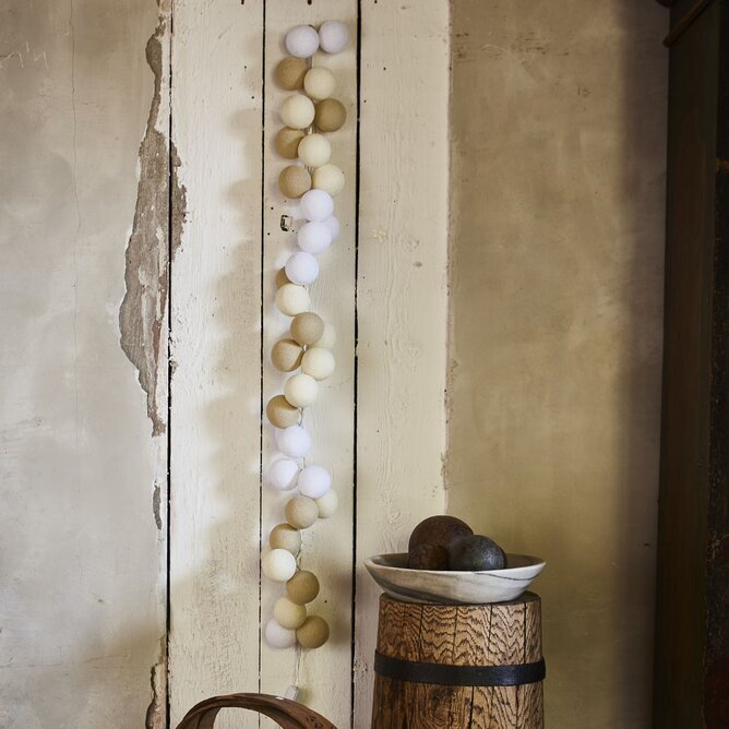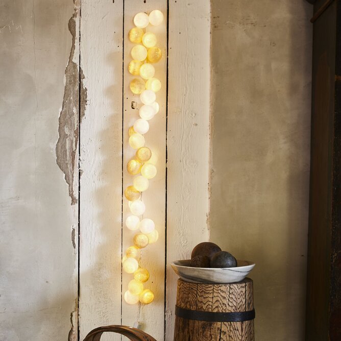 Använd ljusslingorna som dekoration, mysbelysning, till festligheter mm. Fin att dekorera på dukat bord, i barnrum, sovrum mm. Bollarna är virade av färgat garn och är ca 6-7 cm i diameter. Finns en mängd olika kombinationer & storlekar där man kan välja vanlig stickkontakt eller USB-kontakt. Man sätter själv ihop ljusslingan med bollarna i den ordning som man önskar ha dem.