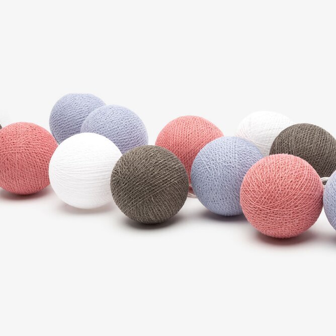 På bilden visas en del av den populära ljusslingan Happy Lights New York som finns hos Köpstaden.se, en butik känd för sitt mångsidiga sortiment av produkter som täcker många av vardagens behov. Bilden fångar en sektion av ljusslingan där färgglada bomullsbollar är arrangerade i en tilltalande kombination. Varje boll har en yta som är omsorgsfullt formad av intrikata bomullstrådar, vilket ger dem en mjuk och behaglig struktur.