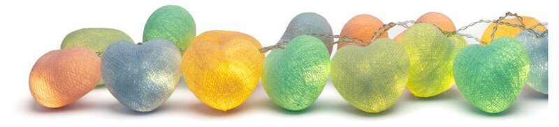 Denna ljusslinga innehåller bollar i olika färgnyanser som sträcker sig från dova pasteller till mer iögonfallande toner. Till vänster kan man urskilja ljus i ljusrosa och gråblå toner, medan mer framträdande nyanser som gult och limegrönt dominerar till höger. Ljusslingan består av ungefär ett dussin bollar, vilka är genombrutna av ett mönster som påminner om vävt material, vilket förstärker deras mjuka lyster när de är upplysta.