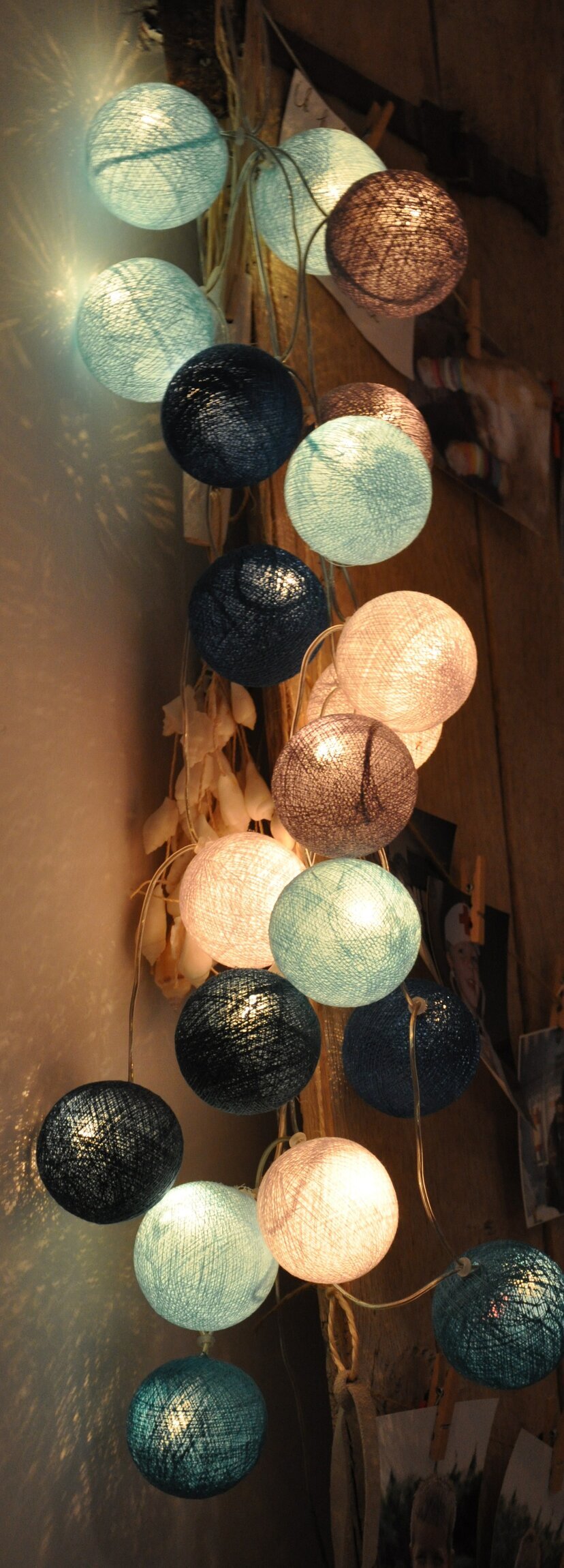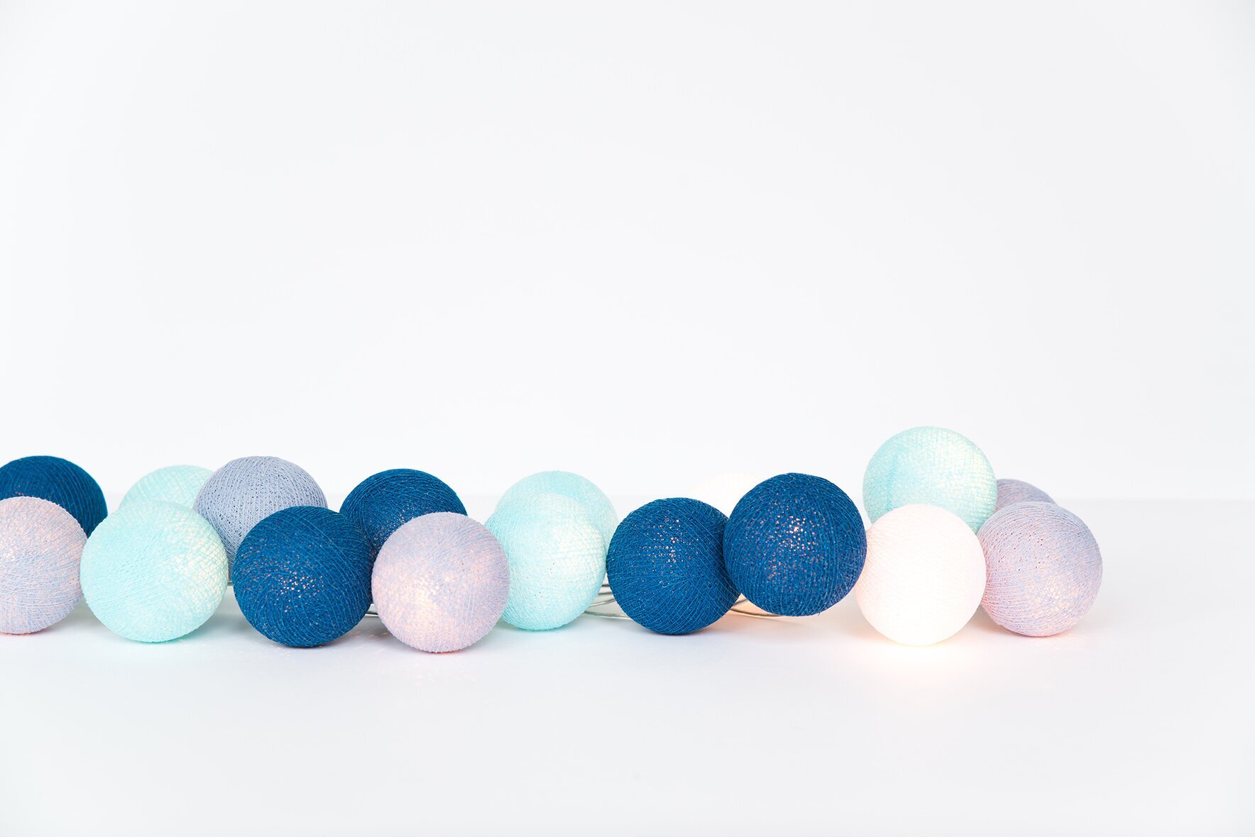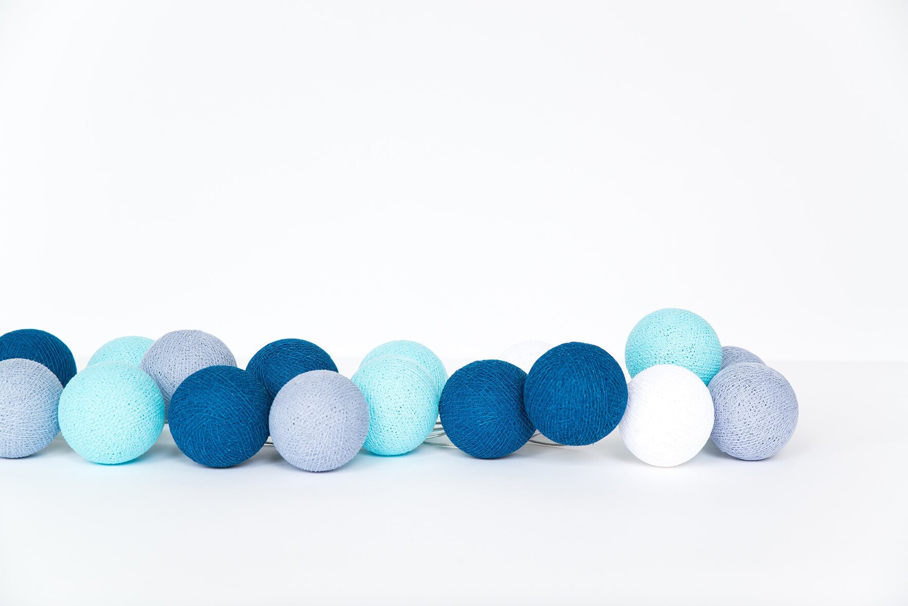 Dessa underbara ljusslingor från Happy Lights kommer förpackade i en box innehållande 35 stycken bollar samt medföljande ljusslinga med 2 stycken extra lampor. Använd ljusslingorna som dekoration, mysbelysning, till festligheter mm. Fin att dekorera på dukat bord, i barnrummet osv. Bollarna är virade av färgat garn och är ca 6-7 cm i diameter. Finns en mängd av olika kombinationer & denna boxen innehåller färgerna White, Sky blue, King´s blue och Blue grey. Man sätter själv ihop ljusslingan med bollarna i den ordning som man vill ha dem. Själva ljusslingan är 4,80 meter & sladden har en vanlig vägkontakt så någon transformator behövs ej. CE-märkt.