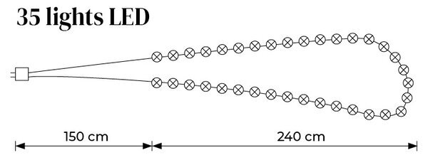 Diagrammet i bilden framhäver ljusslingans totala längd, tydligt uppmätt till 240 centimeter, vilket avslöjar det potentiella användningsområdet för dekoration eller belysning i olika miljöer. Bilden delar också information om den extra kabeln på 150 centimeter, vilket ger flexibilitet vid placering och anslutning av slingan. Detta antyder möjligheter för mångsidiga användningsområden, allt från att lysa upp en bokhylla till att skapa stämning vid festliga tillfällen.