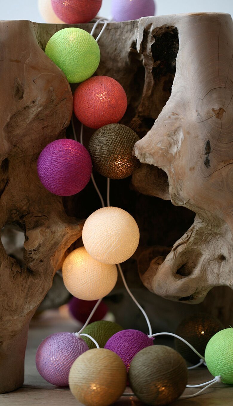 Dessa underbara ljusslingor från Happy Lights kommer förpackade i en box innehållande 20 stycken bollar samt medföljande ljusslinga med 2 stycken extra lampor. Använd ljusslingorna som dekoration, mysbelysning, till festligheter mm. Fin att dekorera på dukat bord, i barnrummet osv. Bollarna är virade av färgat garn och är ca 6-7 cm i diameter. Finns en mängd av olika kombinationer & denna boxen innehåller färgerna Ivory, Old Pink, Light Violet, Cardinal Violet, Moleskin, Light Brown, Khaki, Almond Green. Man sätter själv ihop ljusslingan med bollarna i den ordning som man vill ha dem. Själva ljusslingan är 3 meter & sladden har en vanlig väggkontakt så någon transformator behövs ej. CE-märkt.