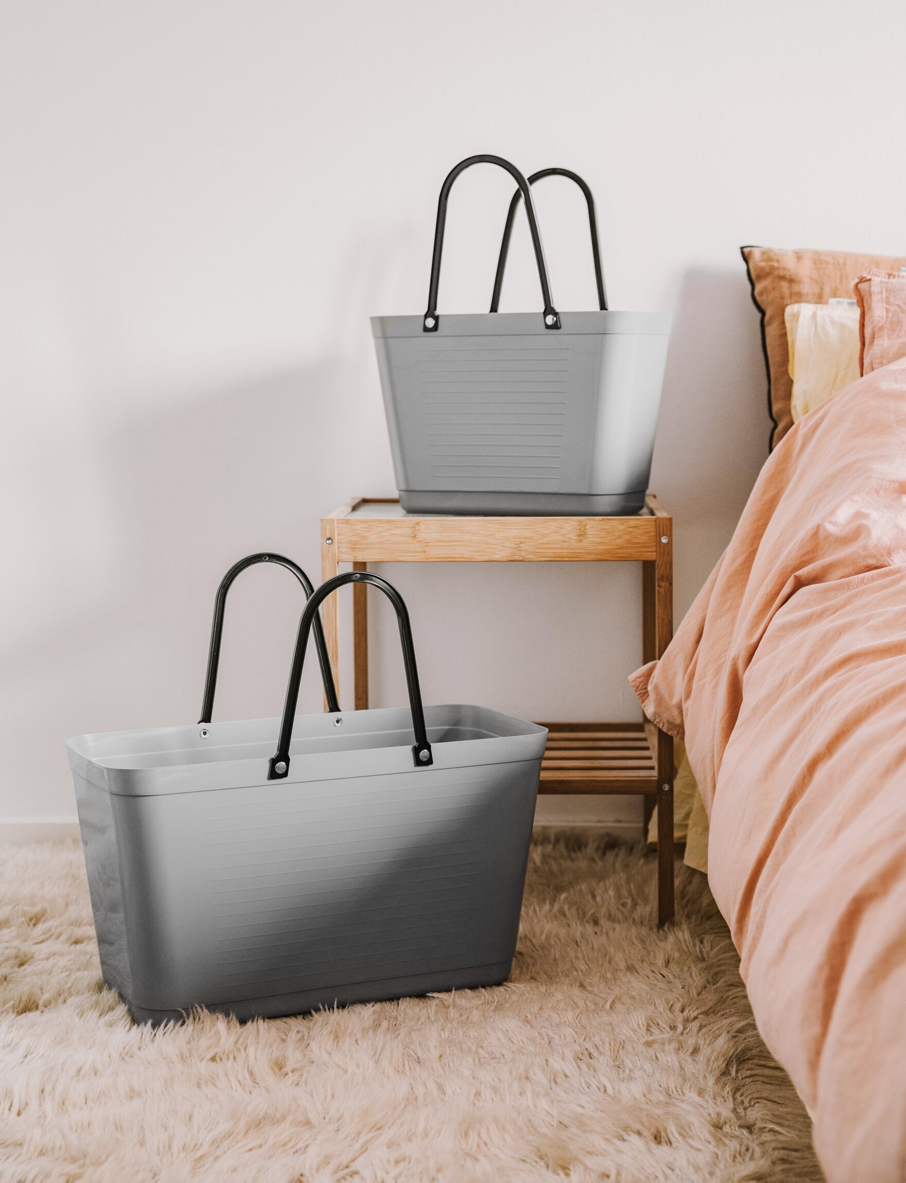Bilden visar en hemtrevlig miljö där två ljusgrå plastväskor av märket Hinza är placerade. Dessa väskor, som finns på Köpstaden.se, är stilrent tillverkade i hållbar plast. De är perfekta för olika ändamål och passar in i vardagens alla situationer.