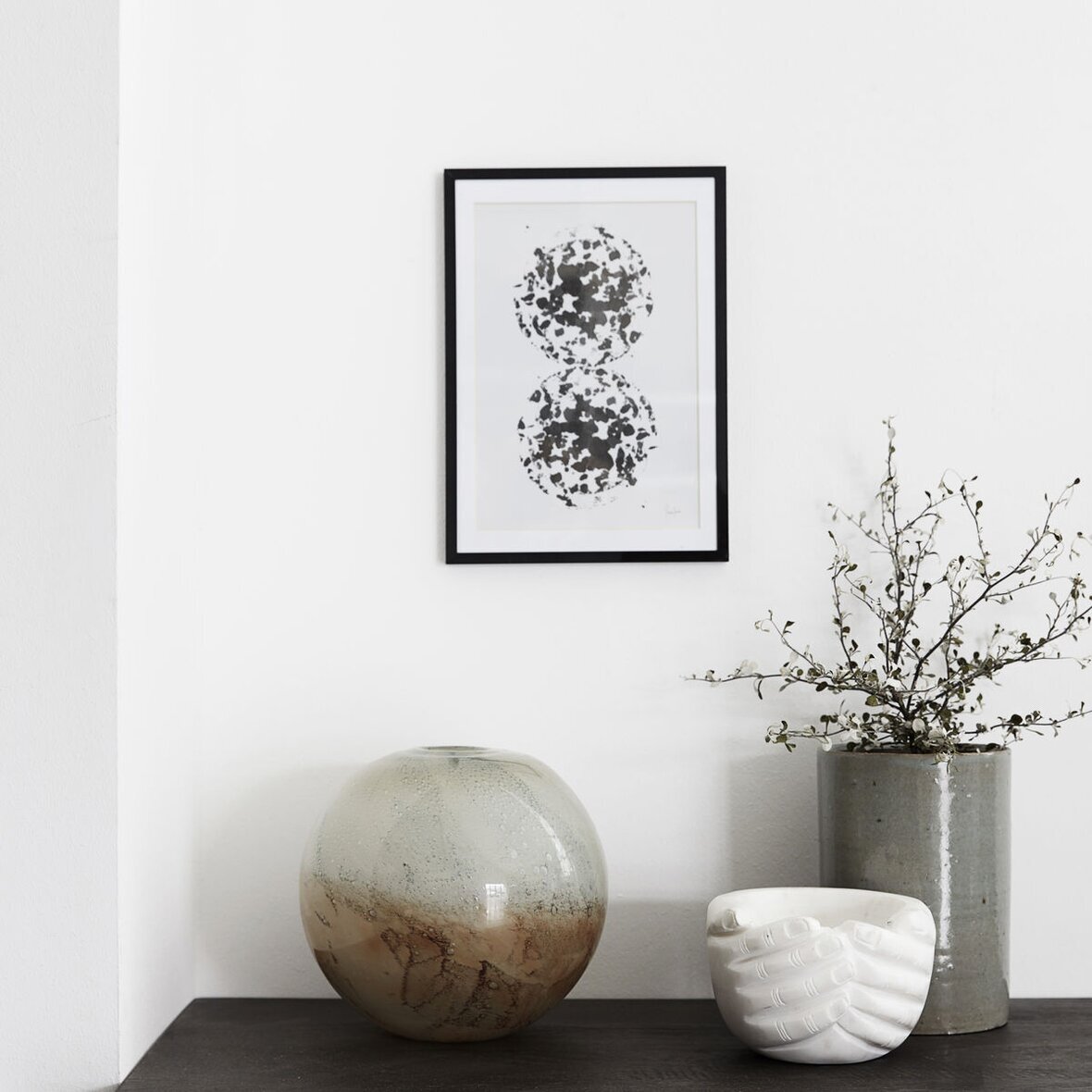 På väggen bakom dessa föremål hänger en inramad konsttryck, vars motiv består av två abstrakta cirklar i svart på en vit bakgrund. Ramen är enkel och svart, vilket håller fokus på konstverket och samtidigt matchar rummets minimalistiska stil.