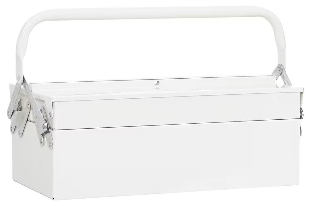Vid en närmare titt framträder de två gångjärnen på vardera sida som utmärkta detaljer av funktionella element, vilka möjliggör att locket enkelt kan lyftas upp för att avslöja dess innehåll. Gångjärnen har en industriell design med synliga skruvar, vilka förstärker verktygslådans robusta karaktär. Det avlånga handtaget, i samma vita nyans som resten av lådan, är böjt för att ge ett bekvämt grepp när lådan ska bäras från plats till plats.