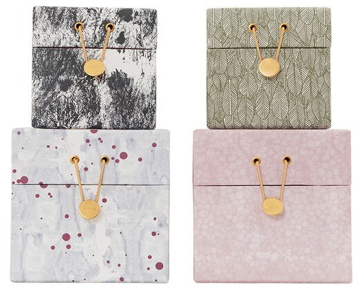 Förutom sina olika färger och mönster delar alla fyra lådor vissa gemensamma egenskaper. Varje låda har en elegant stängningsmekanism bestående av ett guldliknande spänne med två snören fästa i varje hörn av locket. Denna lösning ger både en stilren och funktionell aspekt som kan bidra till att hålla innehållet säkert och organiserat.