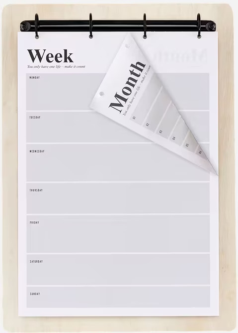 I bildens överkant syns texten "Week", vilket ger ett direkt intryck av produktens funktion som veckoplanerare. Under den titeln finns en inspirerande uppmaning, något som kan motivera användaren i vardagen. De svarta ringarna i toppen av kalendern håller ihop alla sidor och ger möjlighet att enkelt bläddra mellan veckorna, vilket ger flexibilitet och långsiktighet i användningen.