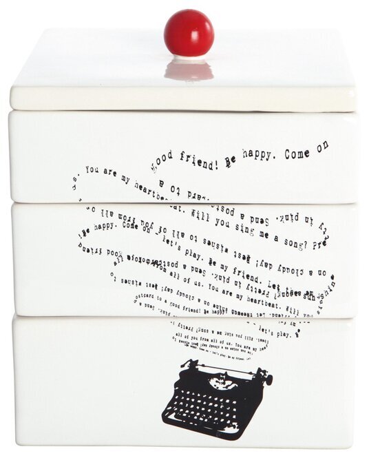Boxen, som kallas Boxar Typewriter, består av tre vita staplade sektioner, vilka ger ett minimalistiskt och stilrent intryck. På den släta ytan finns en kreativ och konstnärlig illustration som föreställer en klassisk skrivmaskin. Från skrivmaskinens tangentbord flödar en mängd små tecken och ord uppåt i en böljande rörelse, vilket ger en känsla av kreativitet och rörelse. Den grafiska representationen av ord utspridda i luften ger en hint av nostalgi och litterär elegans, idealisk för den som uppskattar både praktisk användning och estetiska detaljer.