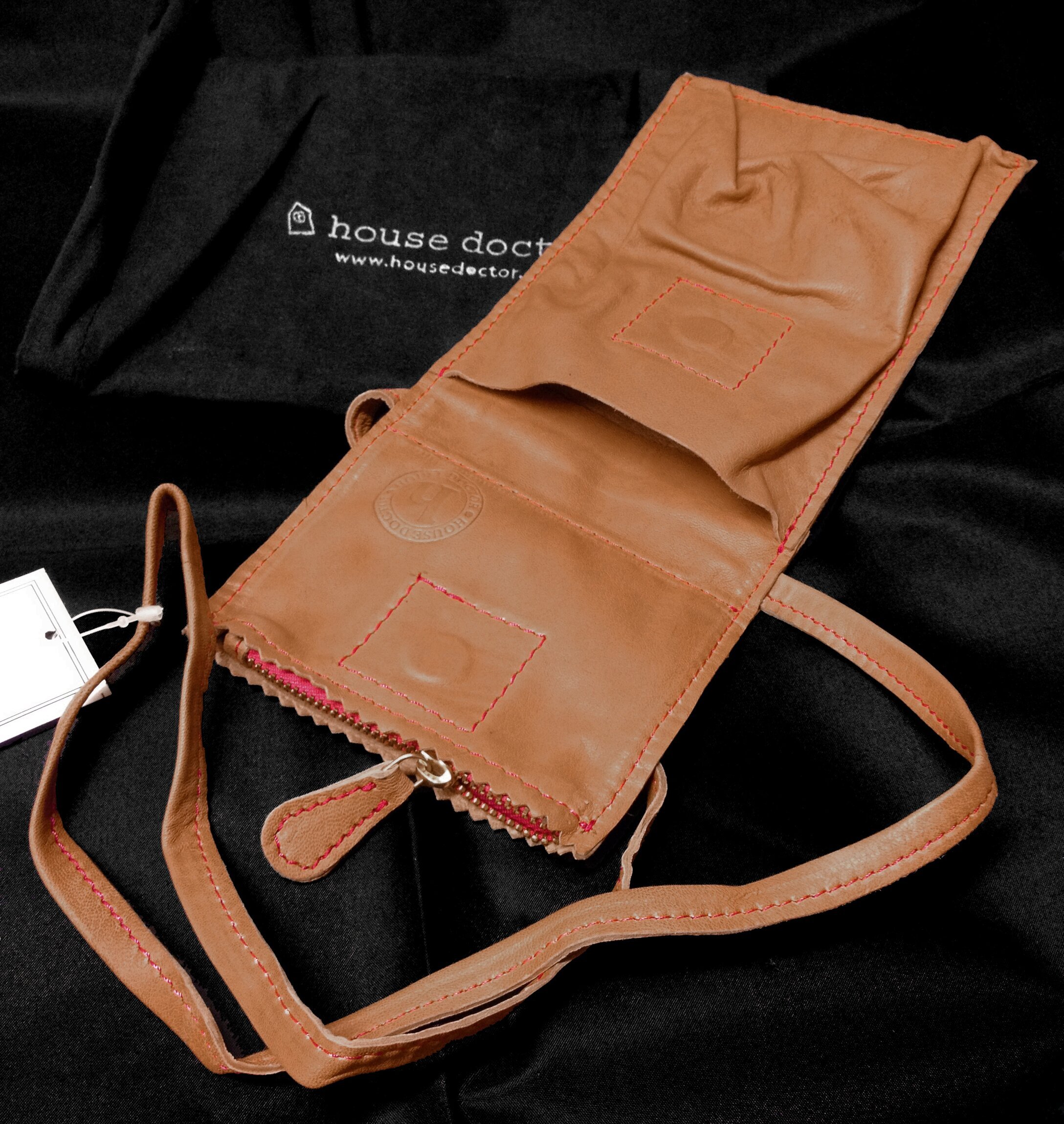 Bildens fokus är en halsväska i läder från varumärket House Doctor, en del av sortimentet hos den mångsidiga butiken Köpstaden.se. Väskan vilar på en mörk, kanske svart, textilbakgrund som skapar en skarp kontrast till lädrets varma och jordnära toner. Lädret har en jämn, slät yta med subtila variationer som bidrar till en naturlig känsla.