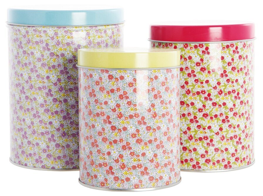 Somriga småblommiga plåtburkar för gryn, pasta, makaroner, bönor mm. - Material: Plåt - Finns i tre olika storlekar. Liten: diameter 9,5 cm, h 12,1 cm. Läs mer