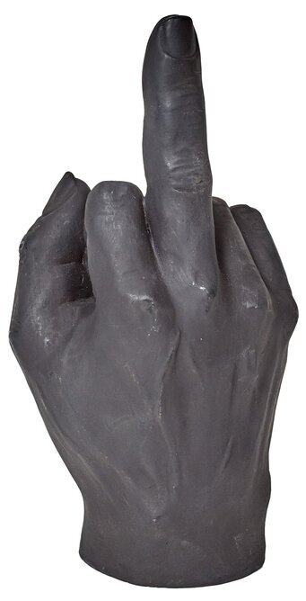 Bildens mittpunkt är en distinkt dekoration som föreställer en hand i en mörk färg med ett utsträckt långfinger. Denna handformade skulptur har en realistisk framtoning med tydliga detaljer såsom knogar och naglar, vilket ger den en autentisk känsla. Ytan är något ojämn, med subtila skiftningar i ton som ger den ett levande utseende. Produkten är en del av Köpstaden.se: s varierade utbud, känd för att erbjuda unika och humoristiska inredningsdetaljer för hemmet.