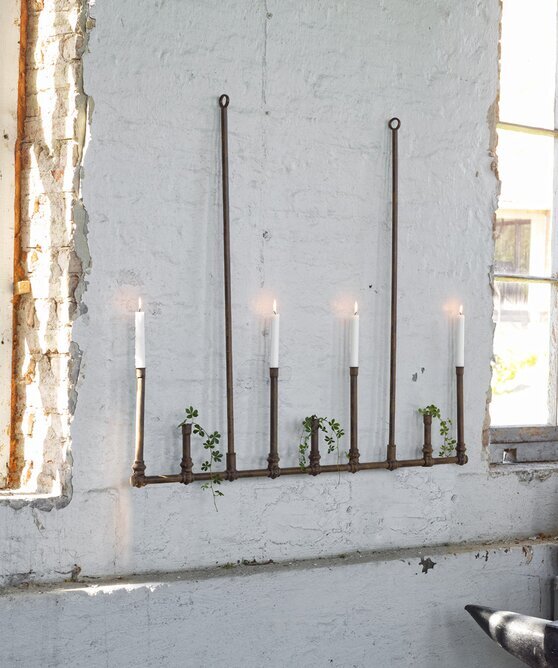 Takkronan består av flera smala, metalliska rör som formar en geometrisk konstruktion. Dessa stålrör har en brunaktig, något patinerad finish som ger en känsla av vintage. Vid varje rör finns plats för ett ljus, vilket bidrar till den funktionella aspekten av denna belysningslösning. De vita ljusen är smala och eleganta, och när de tänds sprider de ett mjukt, varmt sken som reflekteras lekfullt mot ytan av de metalliska rören.