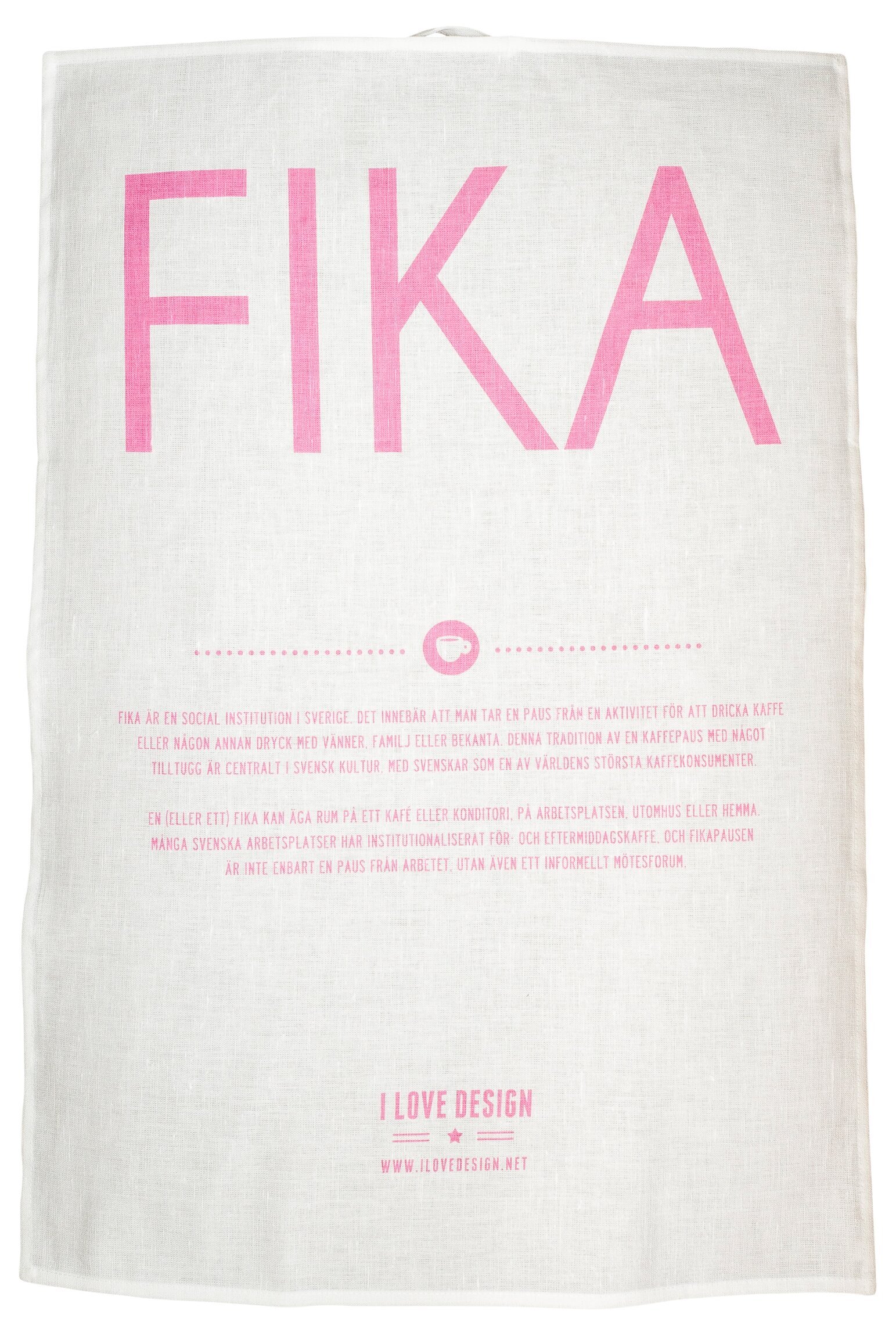 Bilden visar en kökshandduk som går under namnet Kökshandduk FIKA Rosa hos Köpstaden.se. Den kommer från varumärket I Love Design. Handduken har en ljus basfärg som sträcker sig över hela ytan och bär en tydlig och stor text mitt på, där ordet "FIKA" är tryckt i en iögonfallande rosa nyans. Texten ger en direkt association till den svenska kulturen med den informella fikastunden i fokus, vilket förstärks av dess placering och design.