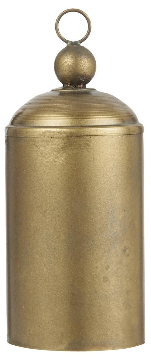 Klockan har en cylindrisk form med en blank och metallisk finish som påminner om mässing. Materialet ger en ljus och reflekterande yta, som kan fånga ljuset på ett vackert sätt och skapa en unik atmosfär i rummet. Toppen av klockan är rundad och avslutas med ett ögleformat handtag, vilket bidrar till dess praktiska och estetiska egenskaper. Detta handtag gör det enkelt att hänga upp klockan i önskat utrymme, vare sig det är inomhus eller utomhus.
