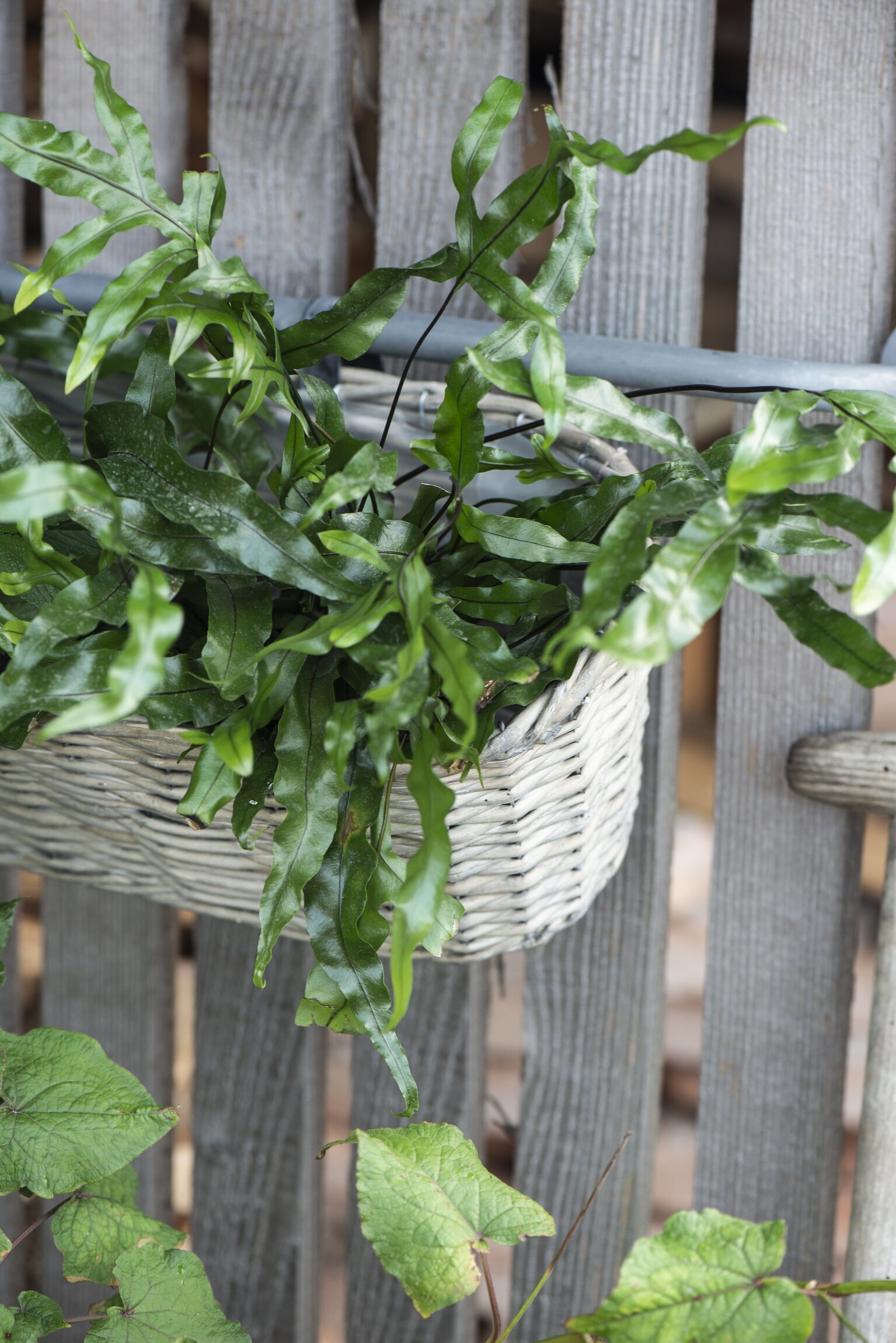 Bilden föreställer en vävd blomlåda från IB Laursen, tillgänglig hos Köpstaden.se, en butik känd för sitt breda utbud av produkter. Denna blomlåda, kallad Blomlåda Pil Med Upphäng, är elegant konstruerad av flätad pil vilket ger den en naturlig och jordnära känsla. På bakgrunden syns en trädetalj, troligen en del av ett staket, med en något grov och ojämn yta. Träets gråa nyans kontrasterar fint mot de gröna växterna som hänger över kanten på blomlådan.