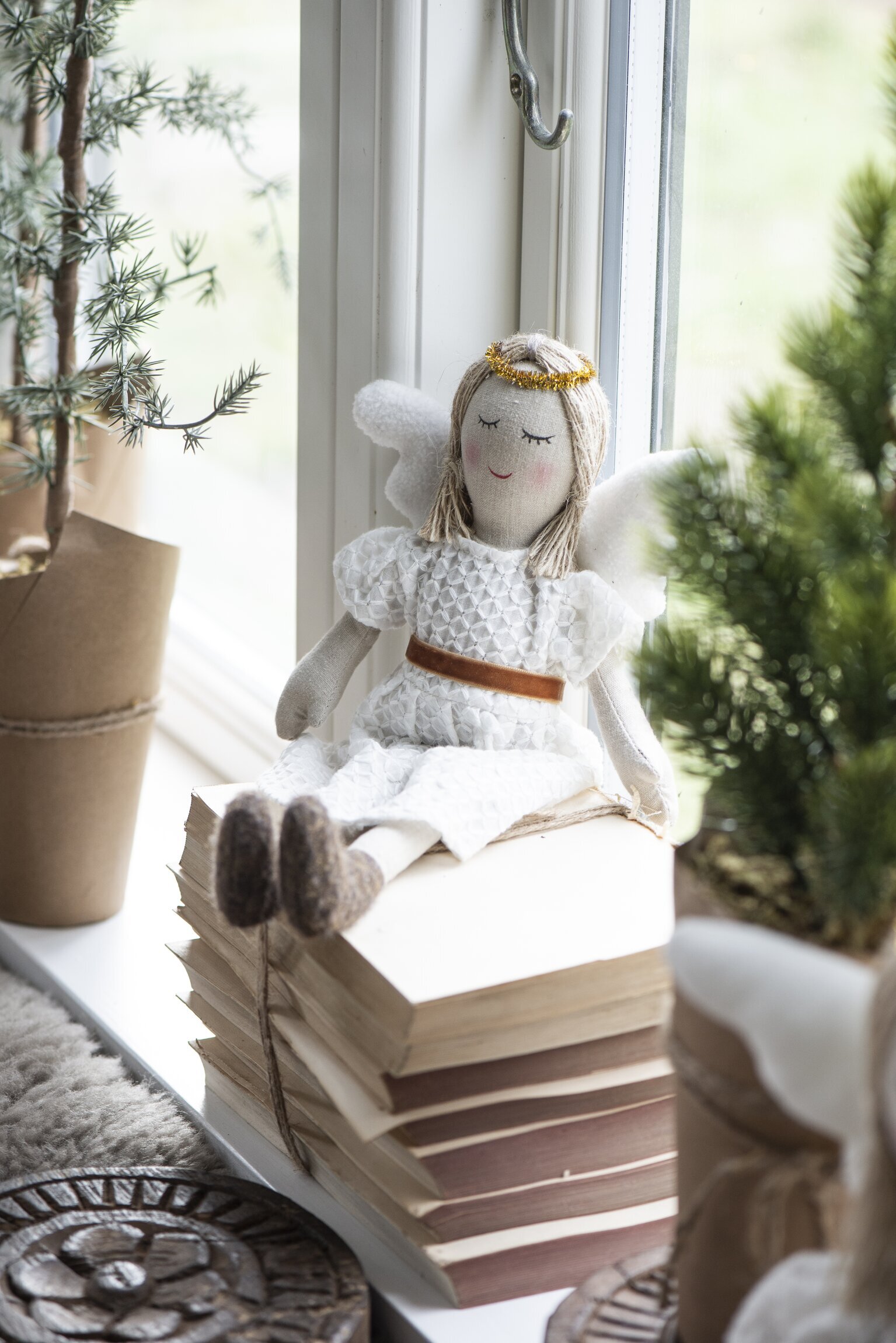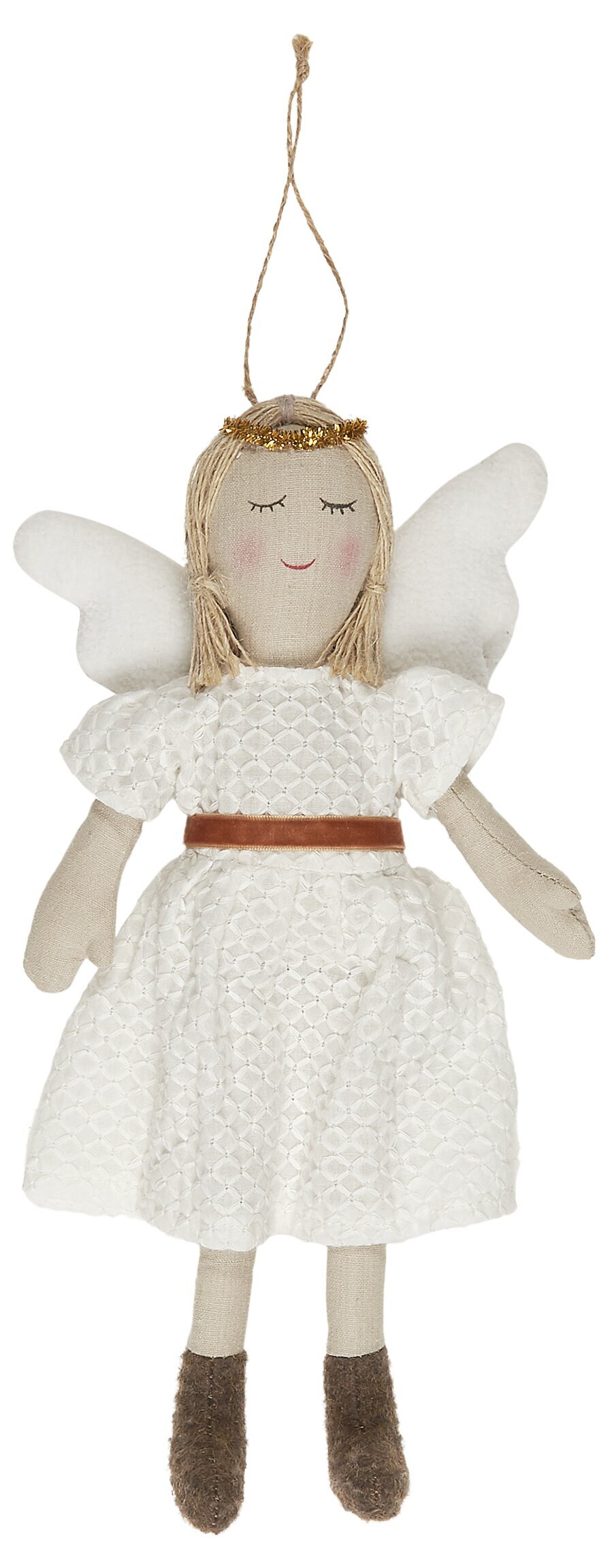 Vacker stor dekorationsängel med vingar & en guldfärgad gloria - en symbol för en god & vänlig ängel. Dekorationsängeln Gabrielle har en fin vit spetsklänning med gyllene bälte, en fin dekoration som kan stå framme året runt.