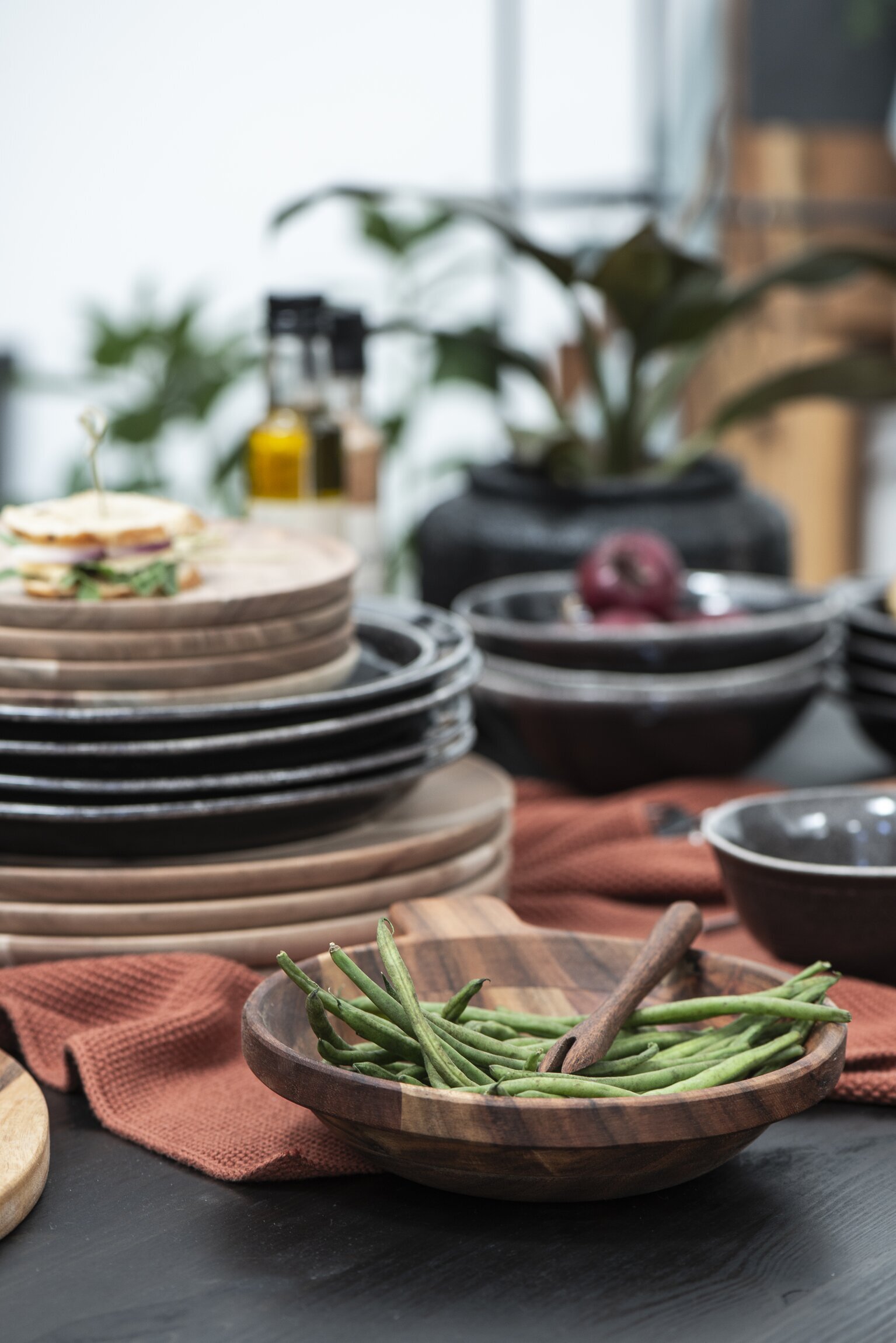 Runt fatet ses en ensemble av staplade tallrikar och skålar i olika nyanser av svart och grått. Tallrikarna, både i keramik och trä, ligger prydligt ovanpå varandra och skapar ett symmetriskt och balanserat intryck. Den mångsidiga kombinationen visar hur man kan skapa ett dynamiskt men ändå harmoniskt uttryck på bordet. Längre bak på bordet finns ytterligare skålar, en del med rödlökar, vilket tillför en subtil färgaccent till helhetsbilden.