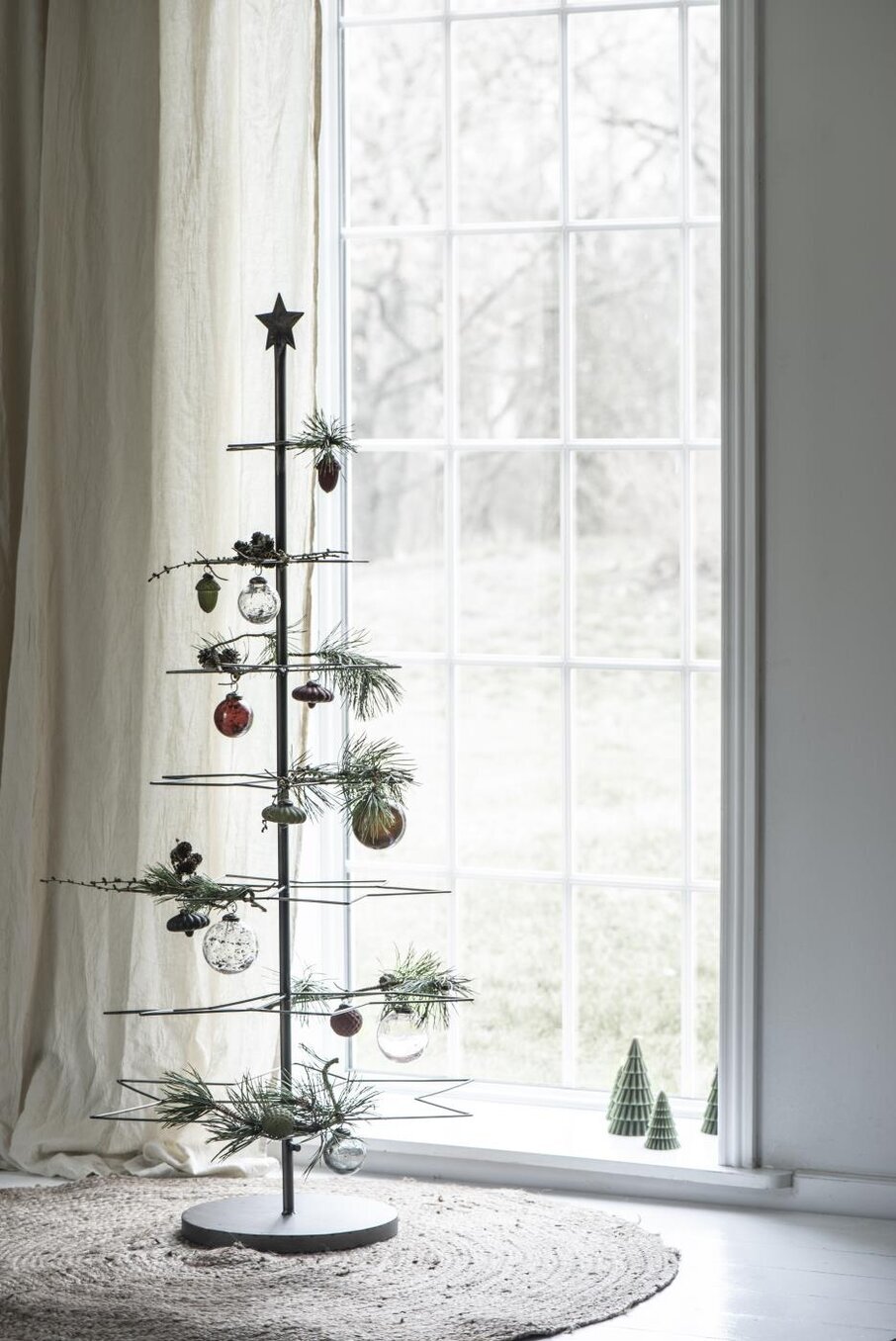 Bilden från Köpstaden.se visar en elegant julgran display från varumärket IB Laursen. I förgrunden ser vi displayen, vars design tar formen av en stiliserad gran. Basen är rund och stabil, gjord av ett mörkt metallmaterial som ger den en känsla av robusthet. Från denna bas reser sig en central stam, kring vilken tunna metallgrenar sträcker sig horisontellt. Dessa grenar arrangeras i olika nivåer, vilket skapar ett luftigt och välbalanserat utseende.