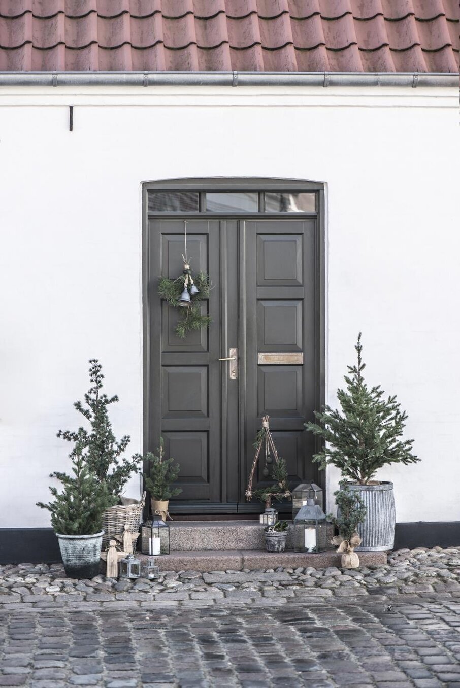 Bildens fokus är en entré som omges av en charmig och rustik atmosfär. Dörren är mörkgrå och består av dubbla sektioner med tydliga, rektangulära paneler. På den vänstra dörren hänger en grön krans, som pryds av två små klockor i metall, vilket ger en hint av festlighet och kanske en antydan om säsongens högtider. Denna dekoration kommer från varumärket IB Laursen, känt för sina stilfulla inredningsdetaljer.