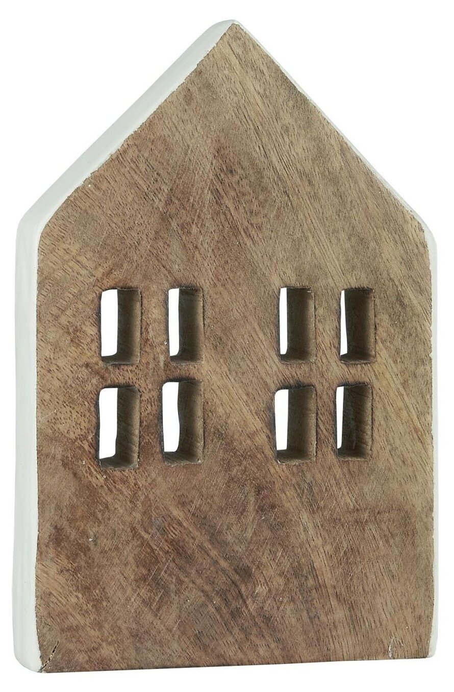 Bilden visar en dekorativ prydnad från Köpstaden.se, ett trähus med namnet Trähus Stående 8 Fönster, skapat av varumärket IB Laursen. Huset är tillverkat av vad som ser ut att vara massivt trä, och har en robust och naturlig känsla. Det ger ett intryck av hantverk med sin rustika och jordnära estetik. Träets yta avslöjar en naturlig textur med subtila nyanser som varierar från ljusare till mörkare bruna toner, vilket förstärker känslan av äkthet och genuint material.