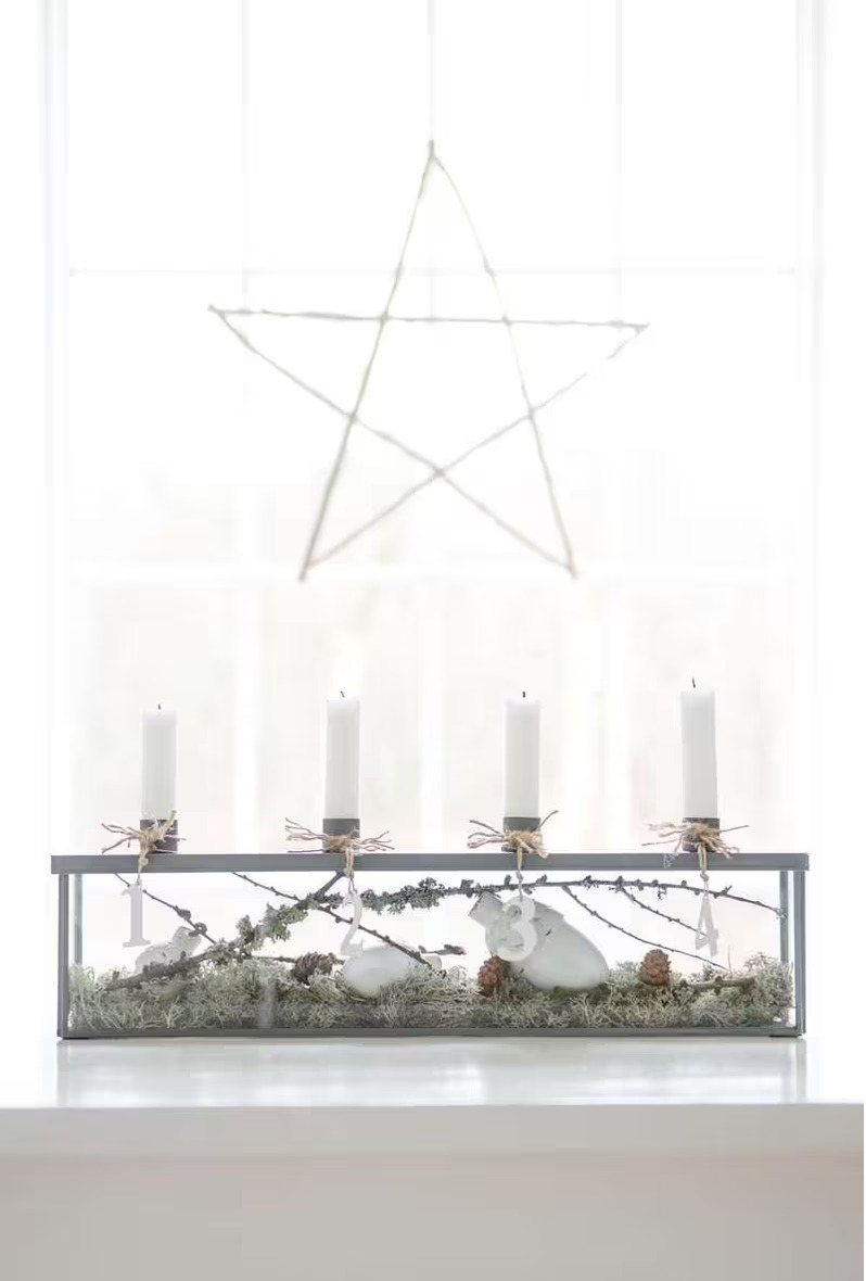 I förgrunden ser vi en avlång ljuslykta, också från sortimentet hos Köpstaden.se. Lyktan är i glas och metalldetaljer, vilket skapar en modern och samtidigt hemtrevlig känsla. Inuti lyktan finns fyra vita ljus uppställda i en rad. Varje ljus är prytt med ett nummer från ett till fyra, vilket ger en charmig adventskänsla. Ljusen är omgivna av naturliga dekorationer som mossa, små kottar och kvistar, vilket förstärker den naturnära atmosfären bilden förmedlar.