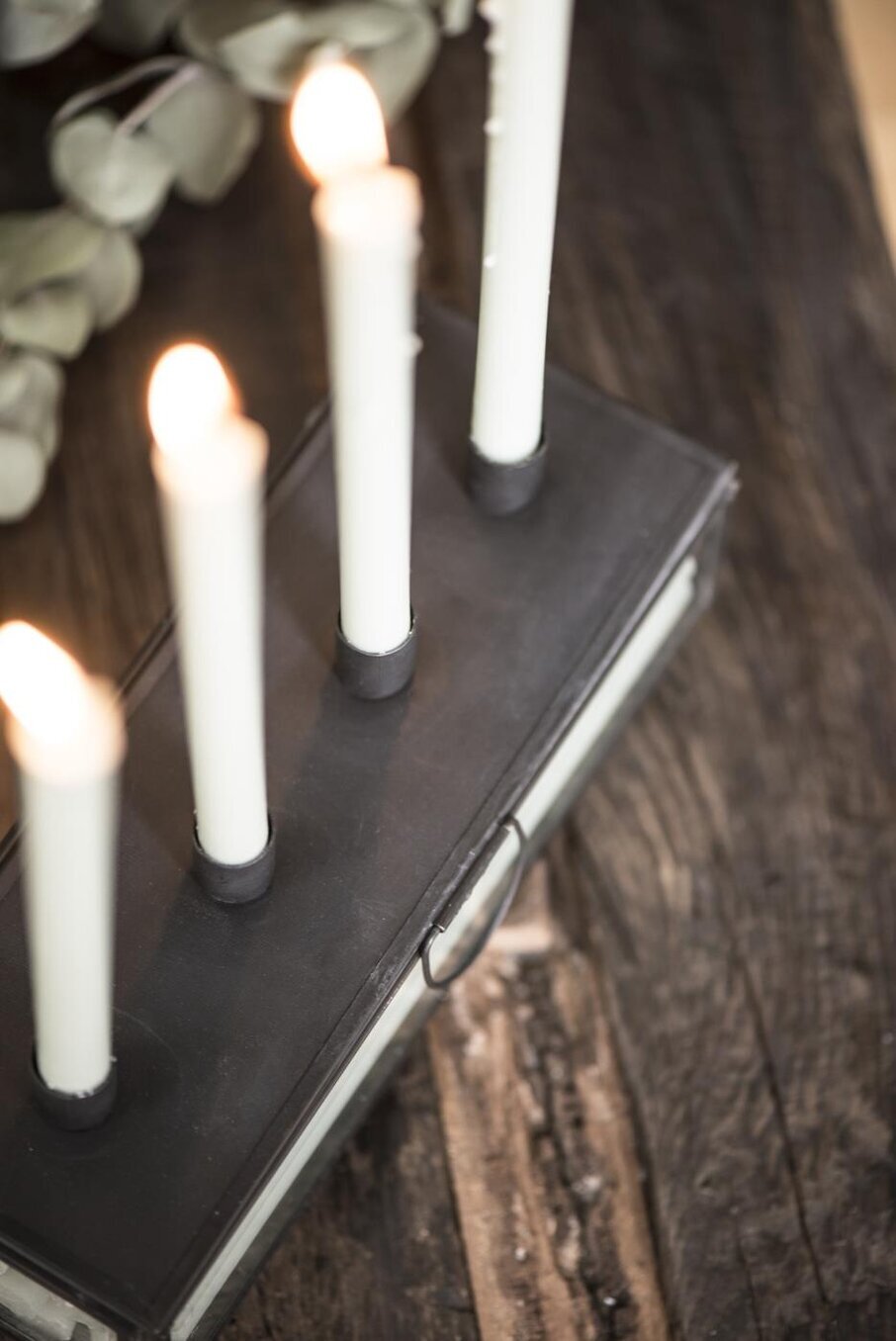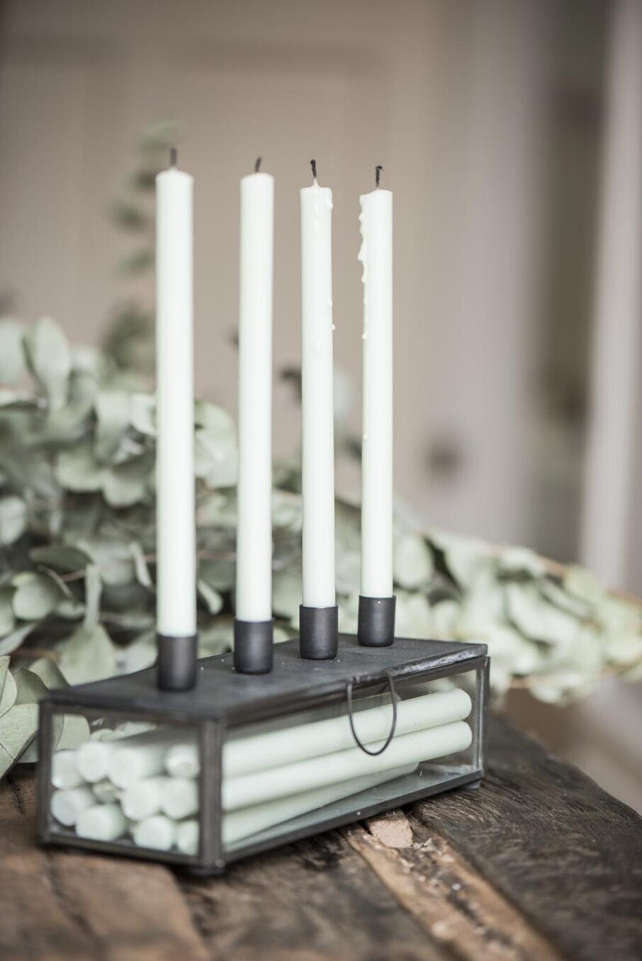 Vacker adventsljusstake i glas & svart metall med plats för julgransljus. Ljusstaken är öppningsbar med praktisk förvaring till stearinljus.