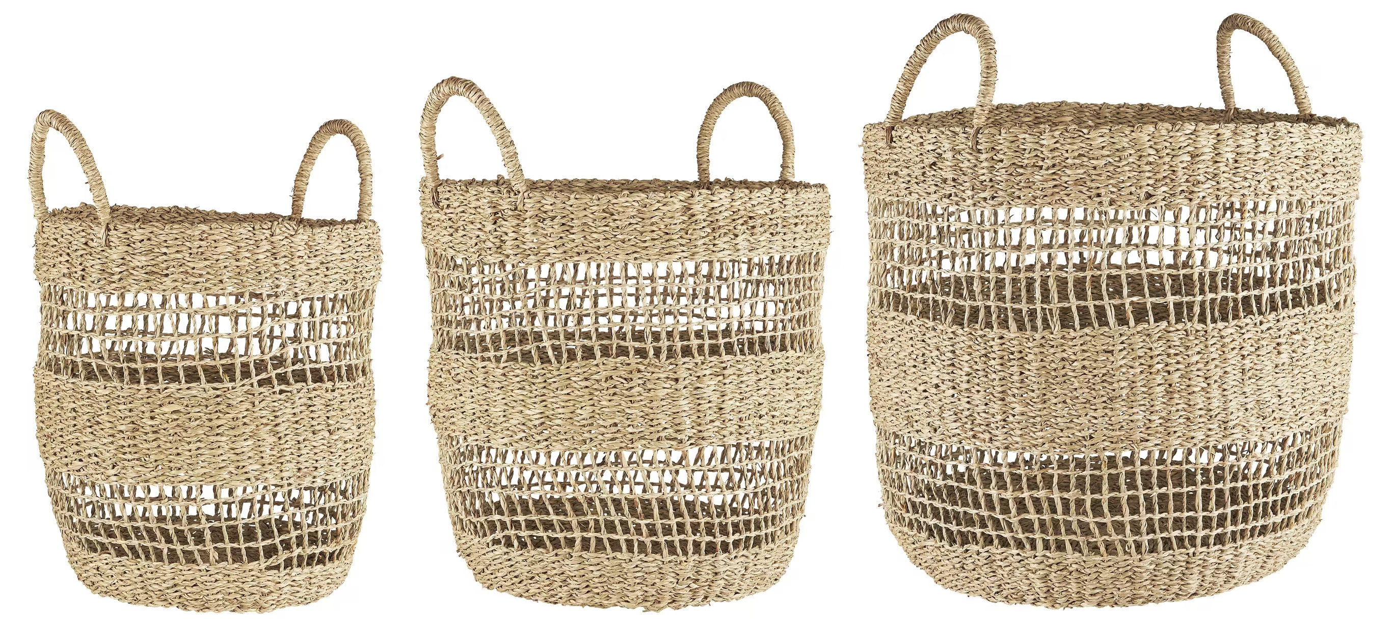 Varje korg är tillverkad av naturliga fibrer som ger dem en jordnära känsla. Materialet ser robust och hållbart ut, vilket antyder att korgarna kan användas till allt från att förvara filtar i vardagsrummet till leksaker i barnkammaren. Flätningen är jämn, vilket skapar en harmonisk textur över korgarnas ytor. Det finns en viss genomskinlighet i väven, vilket ger en luftig känsla och gör att de föremål som förvaras syns igenom lite grand.