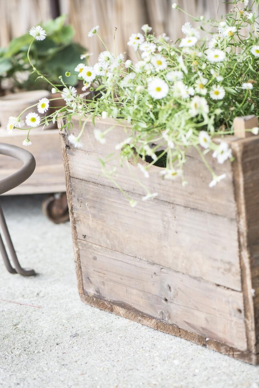 I förgrunden pryds lådan av ett överflöd av små, vita blommor med gula centra. Dessa blommor, vars tunna och gracila stjälkar växer i olika riktningar, kompletterar på ett harmoniskt sätt trälådans enkla skönhet. De grönskande bladen och blommorna ger ett friskt och livfullt inslag, vilket skapar en levande kontrast mot det väderbitna träet.