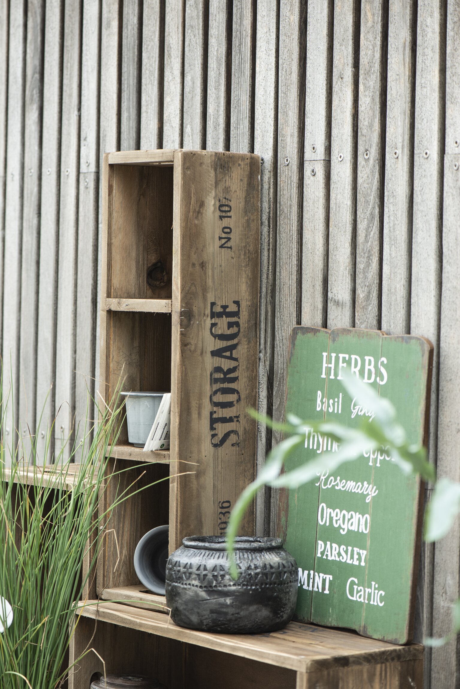 På bilden ser vi en stilfull komposition som skulle kunna vara tagen från vilken inspirerande trädgård som helst. Det dominerande objektet är en rustik trälåda från varumärket IB Laursen, som man kan hitta hos den mångfacetterade butiken Köpstaden.se. Den stående lådan, märkt med ordet "Storage" i en vintage-inspirerad stil, är skapad av trä med en naturlig, varm ton. Den bär en känsla av gamla, men samtidigt tidlösa, verksamheter där funktion möter traditionell estetik.