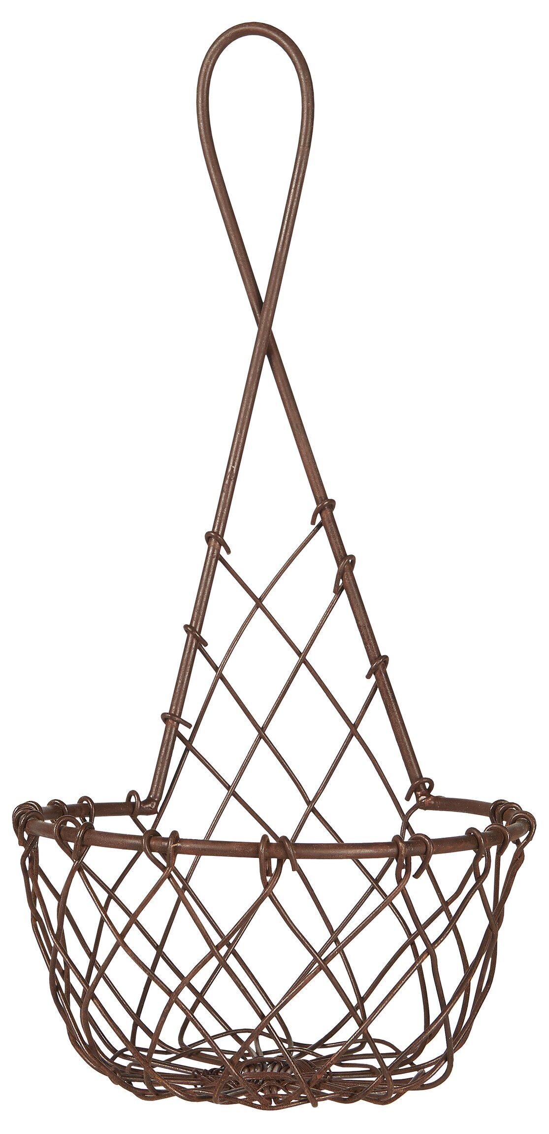 Den översta delen av trådkorgen består av en smidig, cirkulär ram som håller ihop strukturen. Från denna ram sträcker sig två metallöglor som bildar en naturlig upphängningsmekanism. Detta gör att du enkelt kan hänga korgen på väggen, vilket frigör yta och ger ett smart förvaringsalternativ för allt från frukt och grönsaker till hushållsartiklar eller kontorsmaterial.