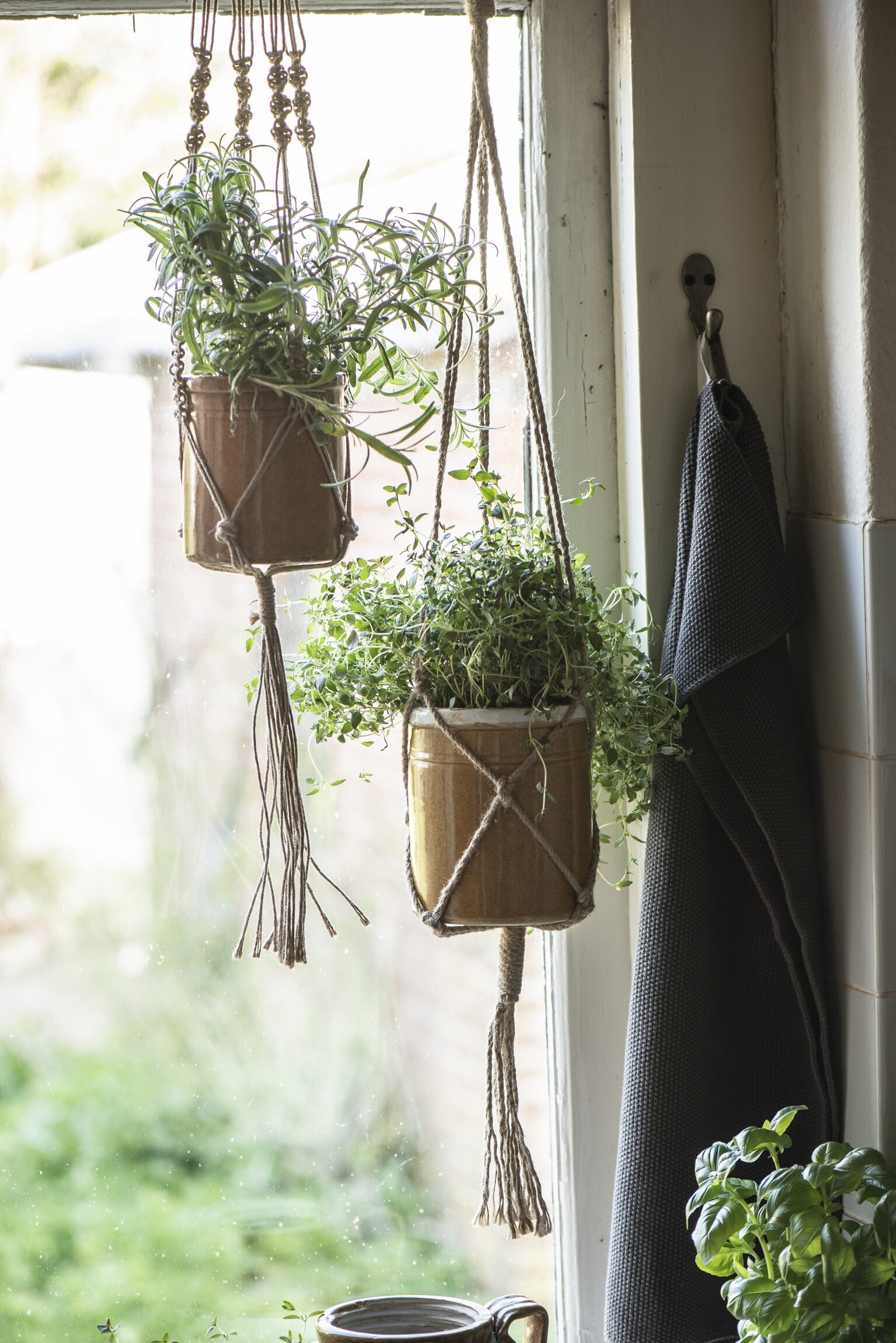 Bredvid fönstret hänger en mörk texturväv av handduk som ger en kontrasterande textur till jutematerialet. Undertill ses en kruka som eventuellt är en del av kökstillbehör, vilket knyter samman hela scenen och gör den till en del av en välanvänd och älskad köksmiljö.