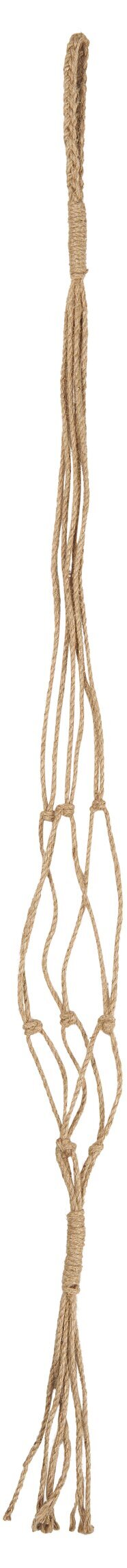 Hängaren består av ett nät av noggrant flätade jutetrådar. I toppen är trådarna samlade i en kraftig ögla, perfekt för att enkelt kunna hänga upp den från en krok eller stång. Vid öglans bas övergår trådarna till finmaskiga, konstfullt knutna delar som bildar ett rutnät. Detta nätverk erbjuder både ett starkt stöd och en estetiskt tilltalande struktur, som har ett intressant och organiskt mönster.