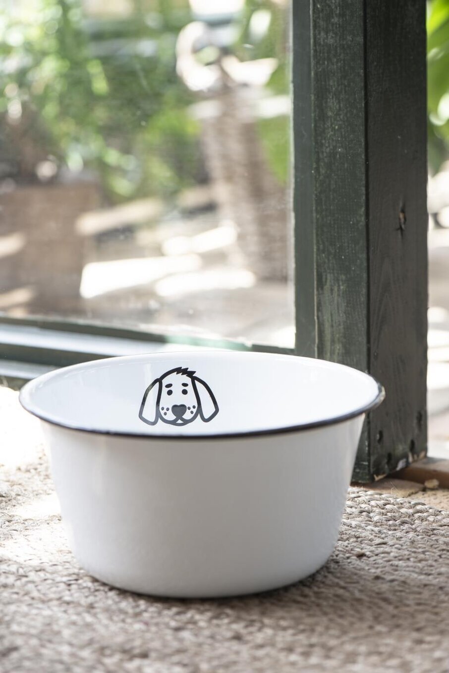Mat eller vattenskål i vit emalj med hundmotiv, finns även i en lite mindre modell.