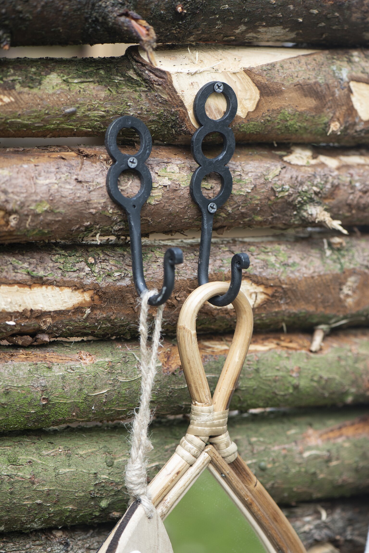Krokarna är tillverkade i smidesjärn, vilket ger ett intryck av både styrka och funktionalitet, och de är fästa med synliga skruvar i samma robusta material. Smidesjärnets färg är djup och mörk, vilket kontrasterar mot de något ljusare trästockarna bakom. Designen av krokarna är stilren men också unik, med en dekorativ ögla i toppen som ger en extra dimension till det annars praktiska verktyget. Den eleganta formen på krokarna gör dem inte bara funktionella utan även till ett estetiskt tillskott till inredningen.
