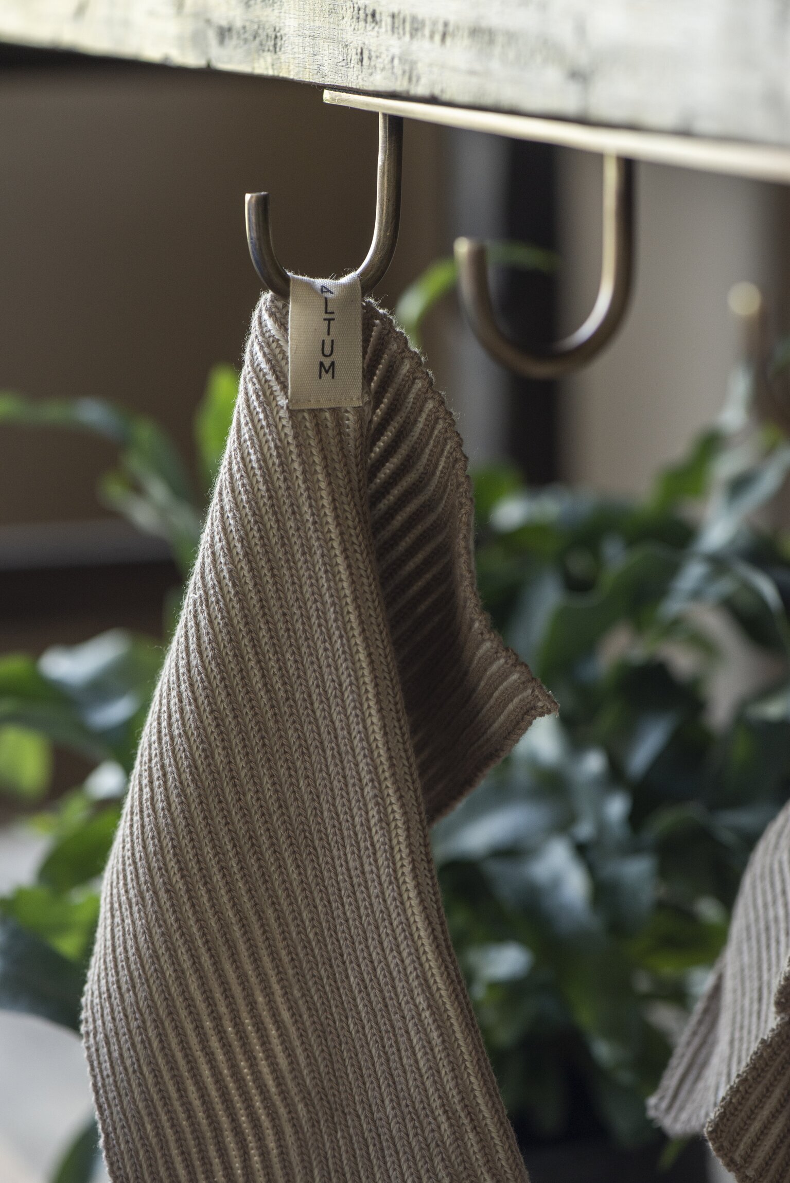 Under kroken hänger en stickad textil, märkt med ordet "ALTUM". Detta framhäver krokens praktiska användning i vardagen. Textilen har en kraftig ribbad struktur som ger bilden en rik textur och ett djupare estetiskt lager. Den jordnära färgen på tyget kontrasterar effektivt mot den gyllene tonen i mässingen, vilket skapar en harmonisk balans mellan mjuka och hårda material.