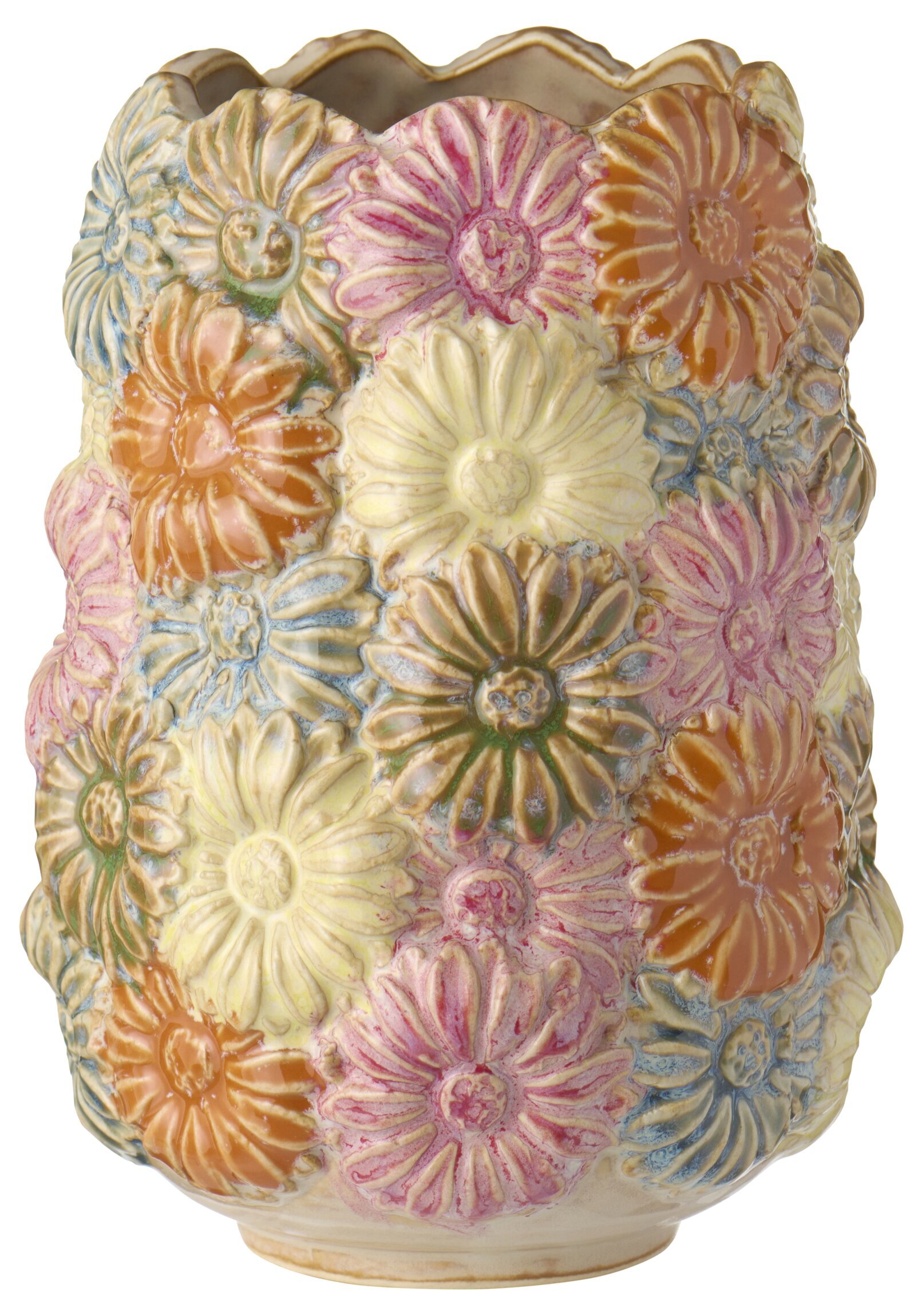 Den här vackra vasen från IB Laursen är en riktig glädjespridare, med sitt reliefmönster av blommor i mjuka pasteller ger den ett levande och personligt uttryck som passar lika fint året om.