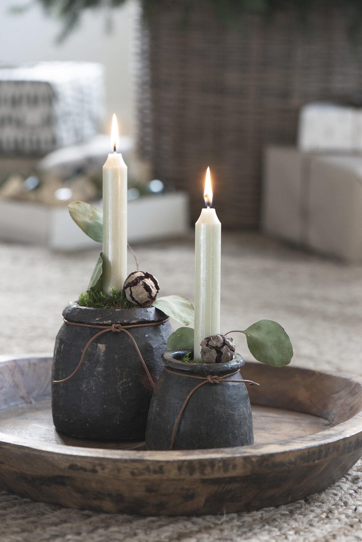 De två krukorna är gjorda av mörk, rå sten som ger en intressant kontrast till de ljusa stearinljusen de håller. Ljusstakarnas yta är aningen ojämn, vilket ytterligare bidrar till den hantverksmässiga känslan. Varje kruka pryds dessutom av ett tunt läderband, som sveper runt den övre delen och ger en subtil touch av naturmaterial.