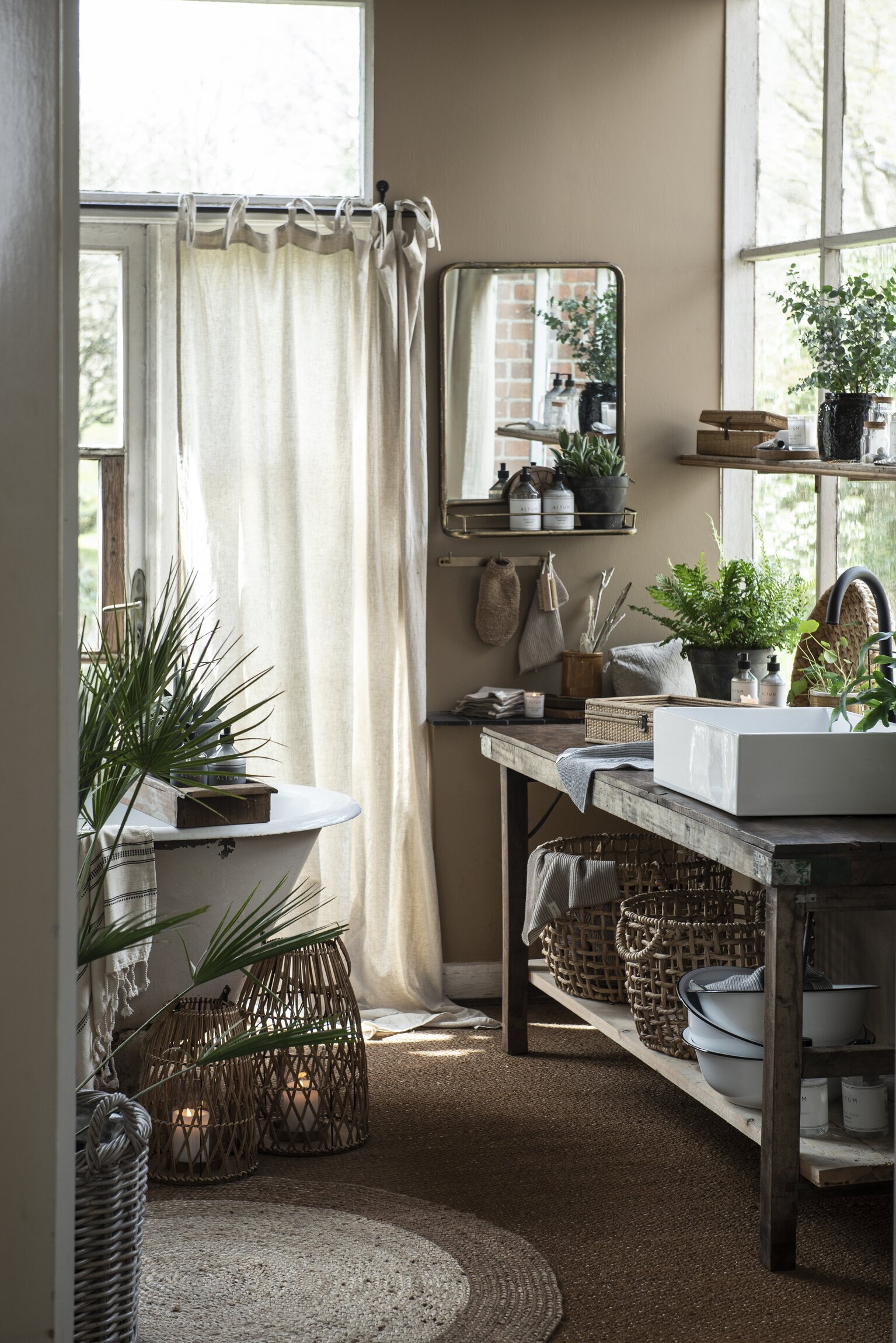 Badrummet domineras av jordnära färger och organiska material. Ett stort fönster släpper in rikligt med dagsljus, vilket ger rummet en ljus och luftig känsla. Gardinerna i en naturlig beige ton hänger löst, vilket bidrar till den avkopplande atmosfären. En gammaldags badkar står i ena hörnet, dekorerat med handdukar och växter som adderar till det hemtrevliga intrycket.
