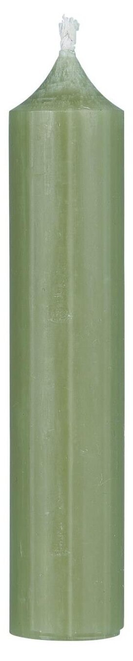 Toppen av ljuset är något avsmalnande och avslutas med en veke som är centralt placerad. Veken har en neutral färgton och är synlig, vilket ger en inblick i ljusets funktion och användning. Den gröna färgen bidrar till att skapa en känsla av lugn och natur, och kan påminna om skog och grönska. Denna färg gör ljuset lämpligt för inredning där man vill införa naturens egen palett.